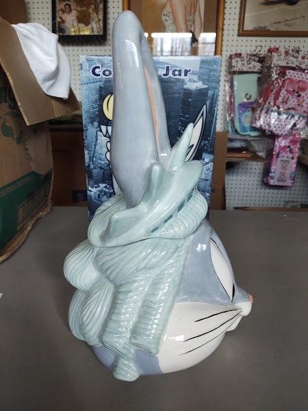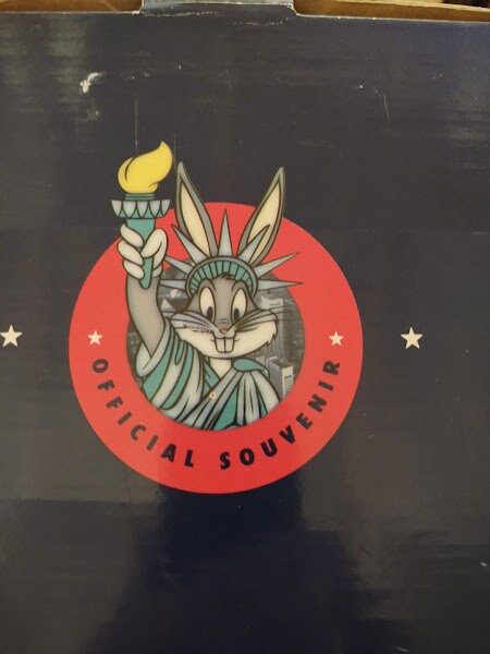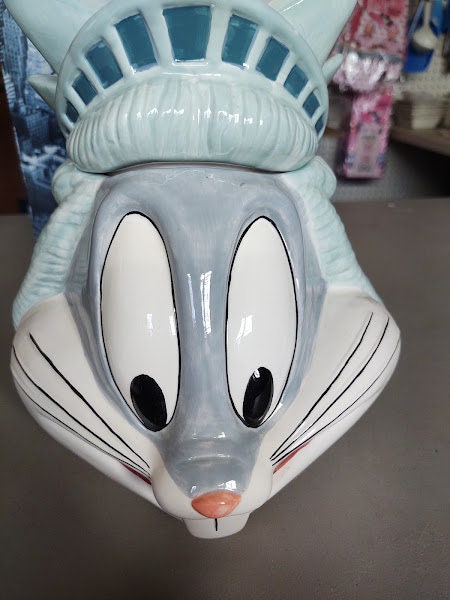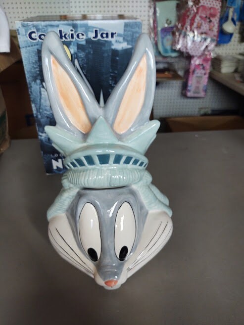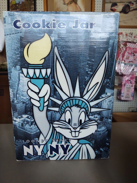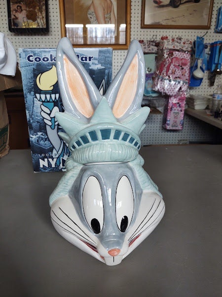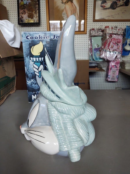 A mint in the box, Bugs Bunny as the statue of Liberty in New York, ceramic cookie jar. From the Warner Bros Studio Stores in the 90's, this classic Looney Tunes jar makes a great gift. What a deal !