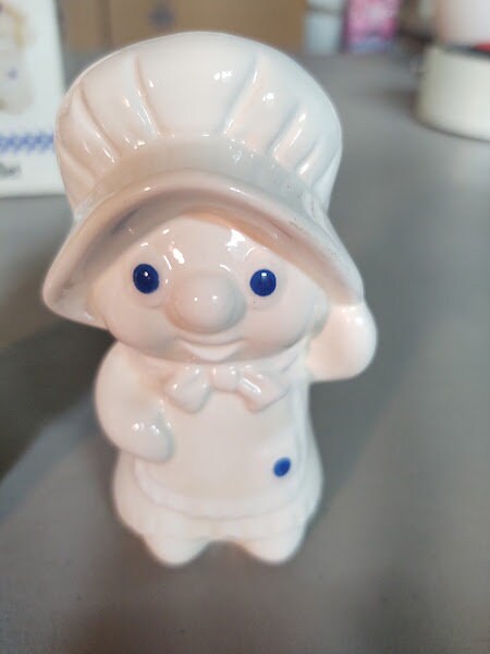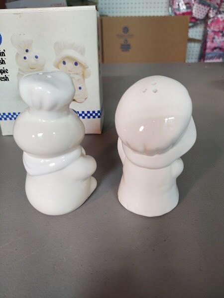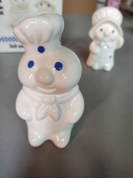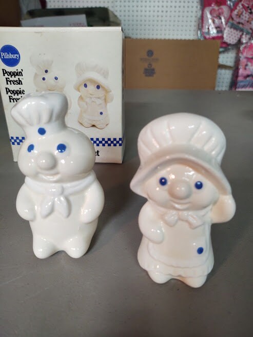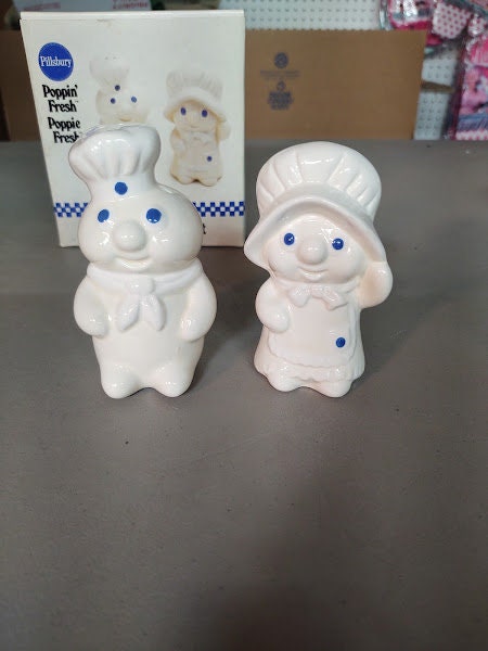 A new in the box, ceramic, Pillsbury Doughboy Poppin Fresh salt and pepper set. Get Poppin and Poppie all for yourself, and still new.