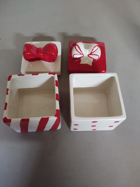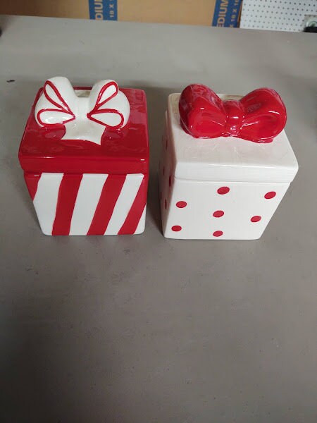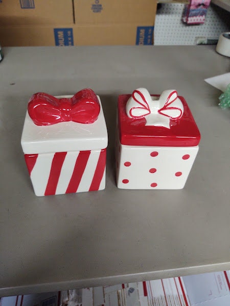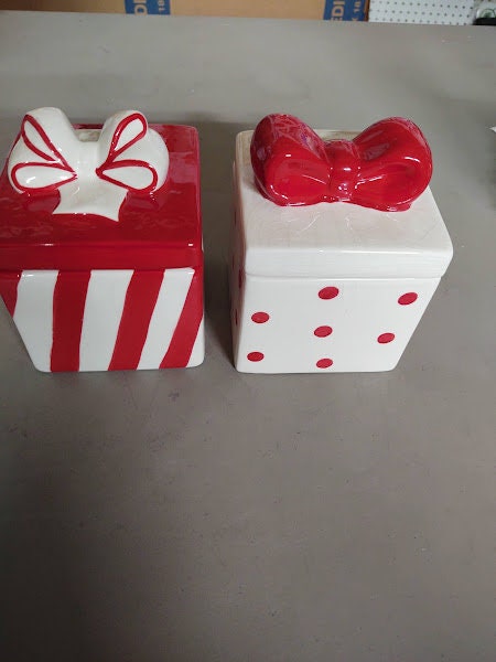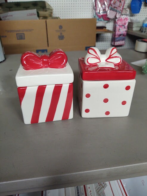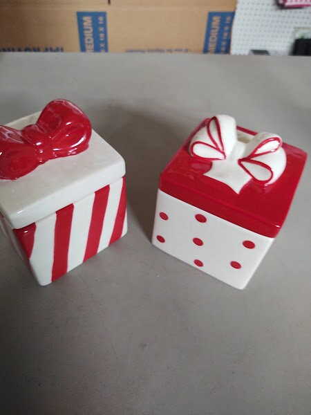 A pretty set of ceramic Christmas candy jars, from Celebrations. You can change the lids around however you like. The perfect holiday look.
