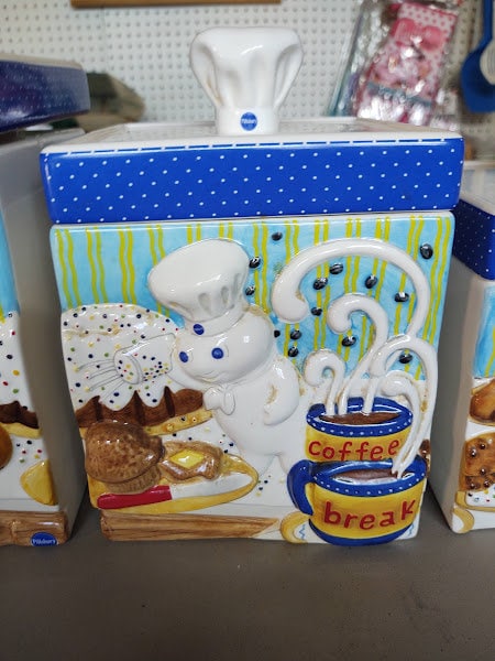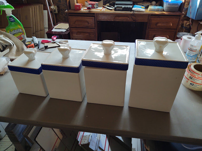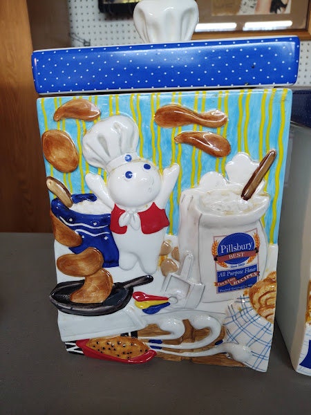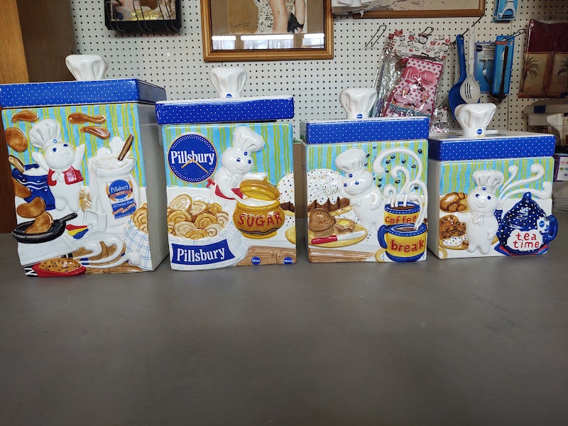 A used Pillsbury Doughboy ceramic canister set from The Danbury Mint. Made in 2000, this popular set is used and has had a few tiny paint touch ups. If you're a collector and you want perfect, this is not your set. But if you want this awesome set at a great price, this is it. I'm selling this for what I have in it, but it's such a wonderful set, somebody needs this for the holidays. Shipping on this is high, but it's a very large well packed box. I just couldn't leave it in my shop, it's bound to brighten the holidays......................Measurements are 11 x 61/2 x 61/2..........10 x 61/2 x61/2............9 x 6 x 6..........8 x 6 x 6 and they have the freshness seals