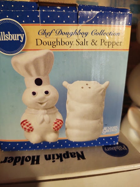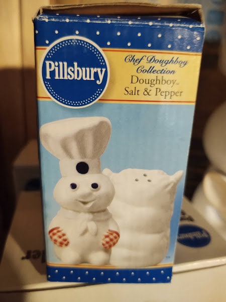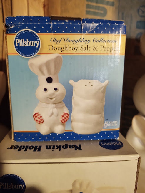 Rare........... A Pillsbury Doughboy Chef ceramic salt and pepper set, new in the box from 2003. The Doughboy Chef line of items are hard to find, and new is a plus.