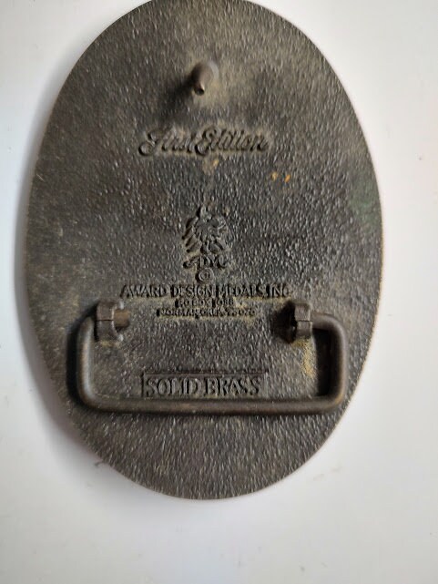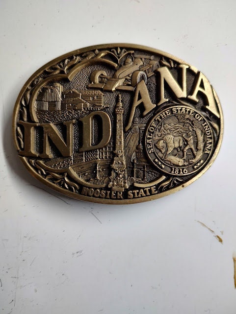 Old used, Indiana Hoosier State, brass belt buckle, measures 3 3/4" x 2 3/4".
