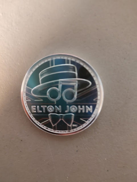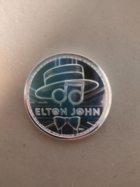 A very collectible, British Music Legends, Elton John 1 ounce silver coin, from the British Mint. Still new and uncirculated.