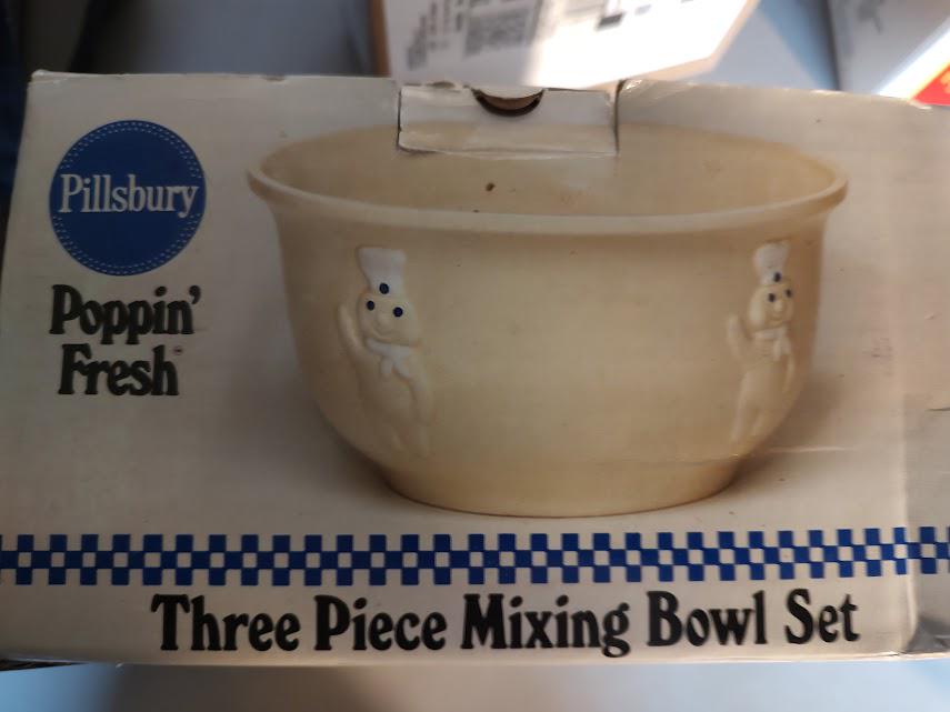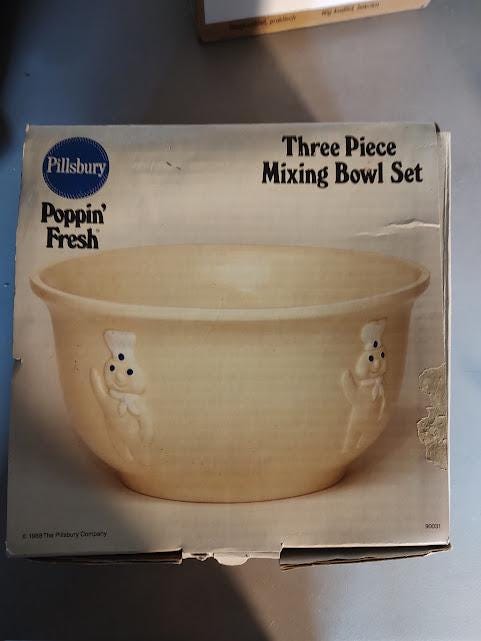 A still new in the box set of Pillsbury Doughboy mixing bowls from 1988. Made in Portugal . Priced right and they ship free.