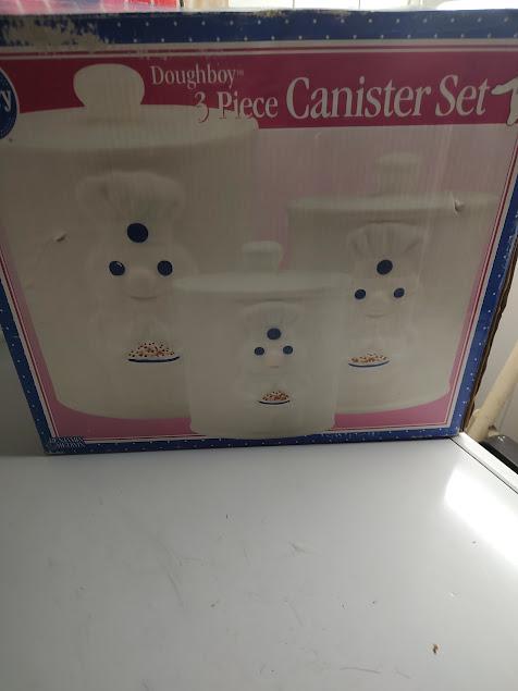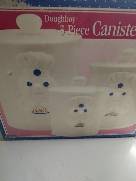 A very nice, ceramic, Pillsbury Doughboy canister set in the original box from Benjamin and Medwin. Made in 1999, these have never been used and the set ships free. All three have the freshness seal.