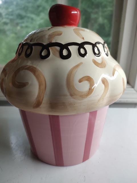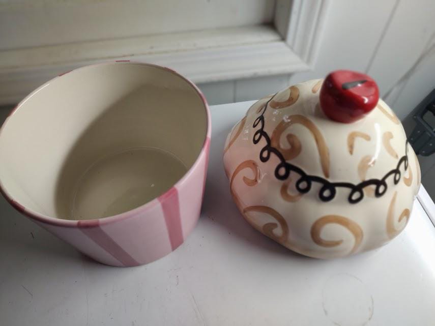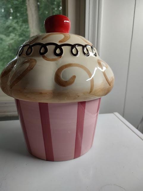 A very nice, ceramic, cupcake cookie jar from American Atelier. Measures 10" x 9" x 9", and really looks bigger than that. Ship to you free.