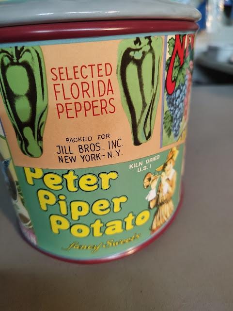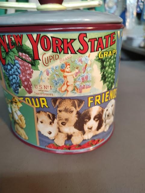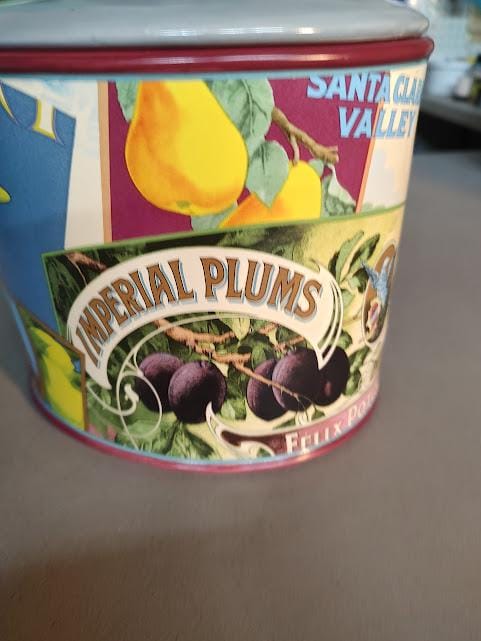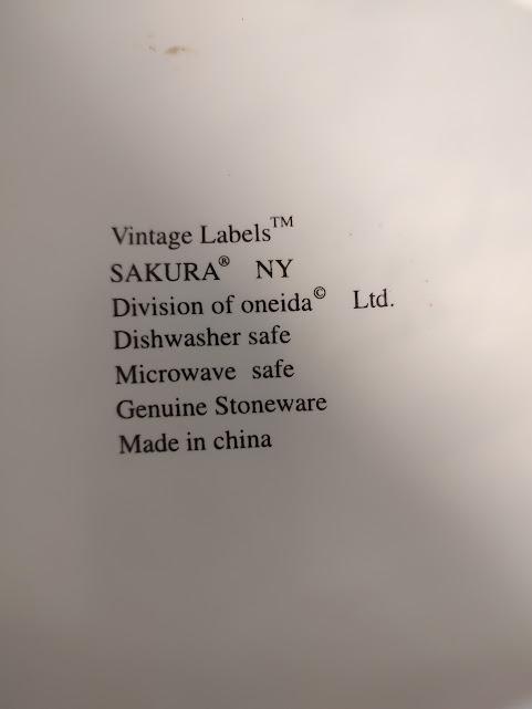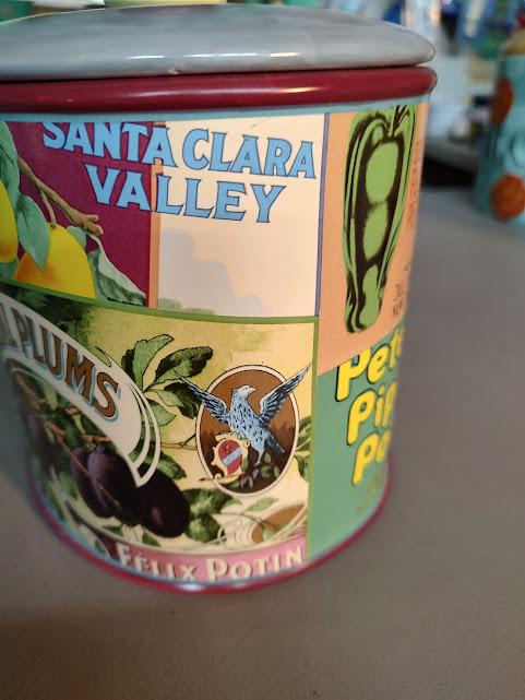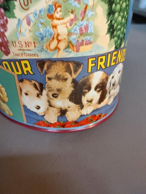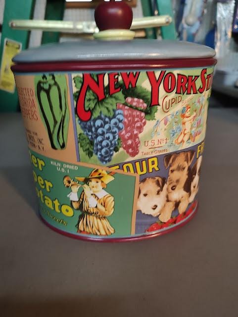 A very nice, heavy, stoneware, Vintage Labels cookie jar from Sakura. Measures 9" x 8" x 6 1/2" and ships free. A very colorful ja and it has the freshness seal.