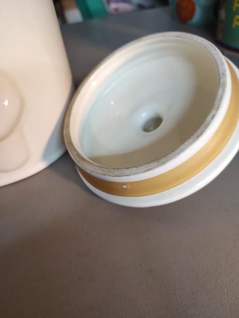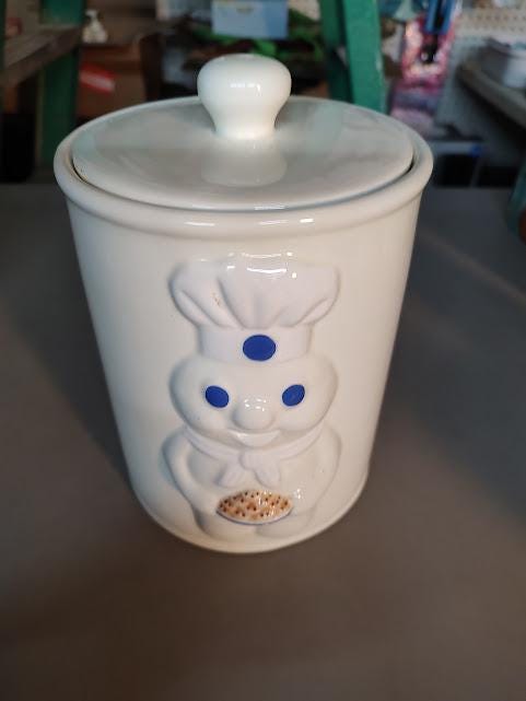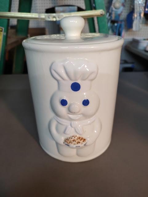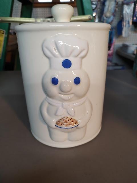 A large, ceramic, Pillsbury Doughboy canister. This one stands 9 1/2" tall with the lid. Good condition and has the freshness seal and ships free.