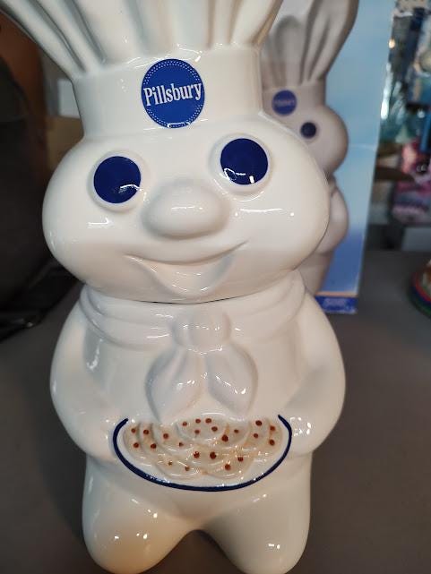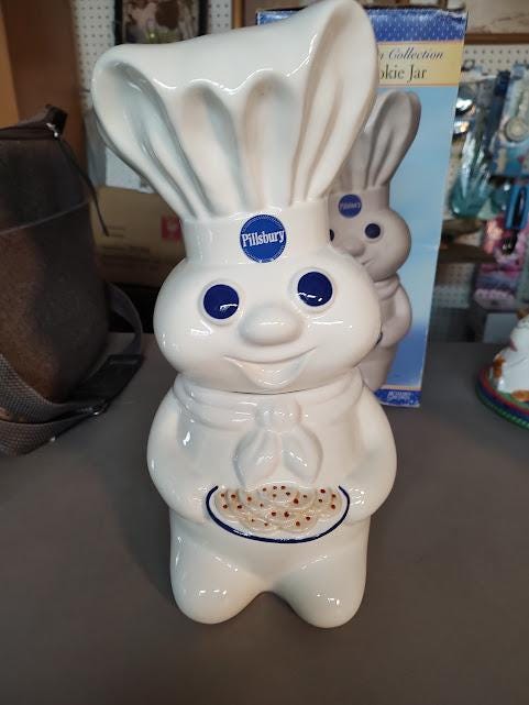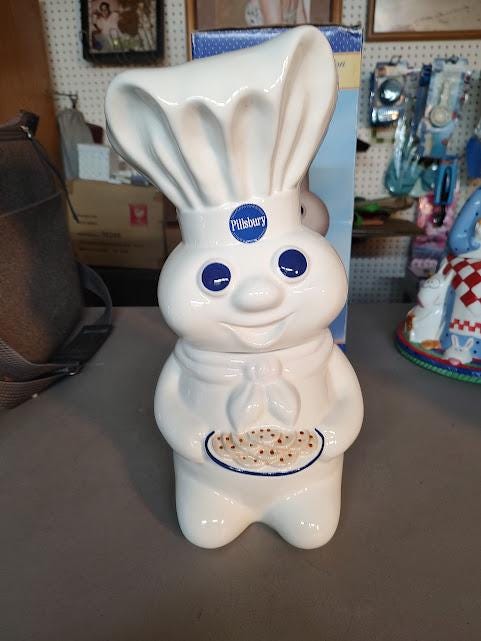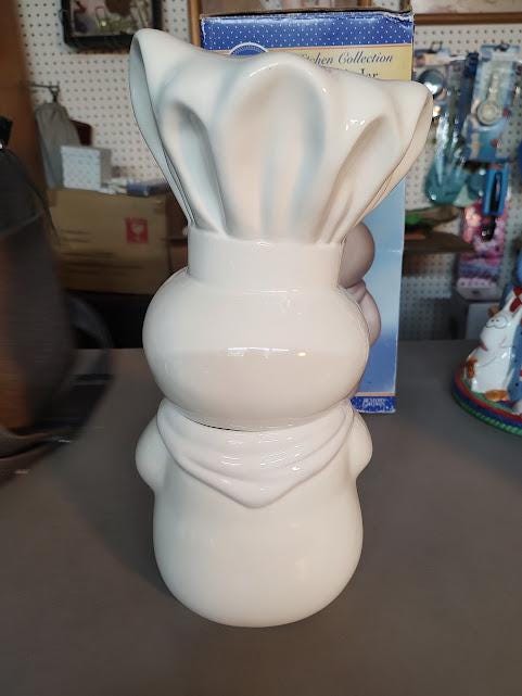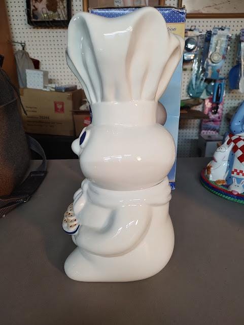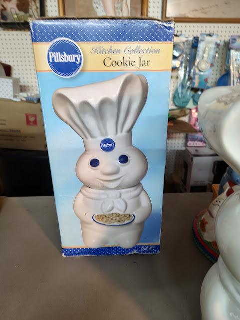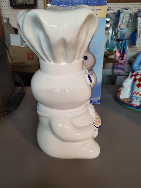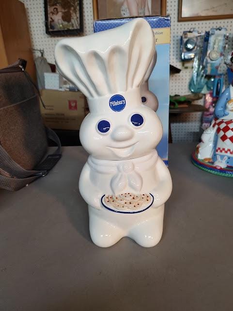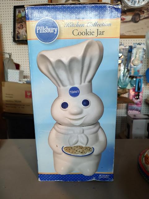 A still new in the box, Pillsbury Doughboy ceramic cookie jar from Benjamin and Medwin. This is the large, 14 inch tall one, from 2003. Still shiny and ships free. Makes a wonderful gift.