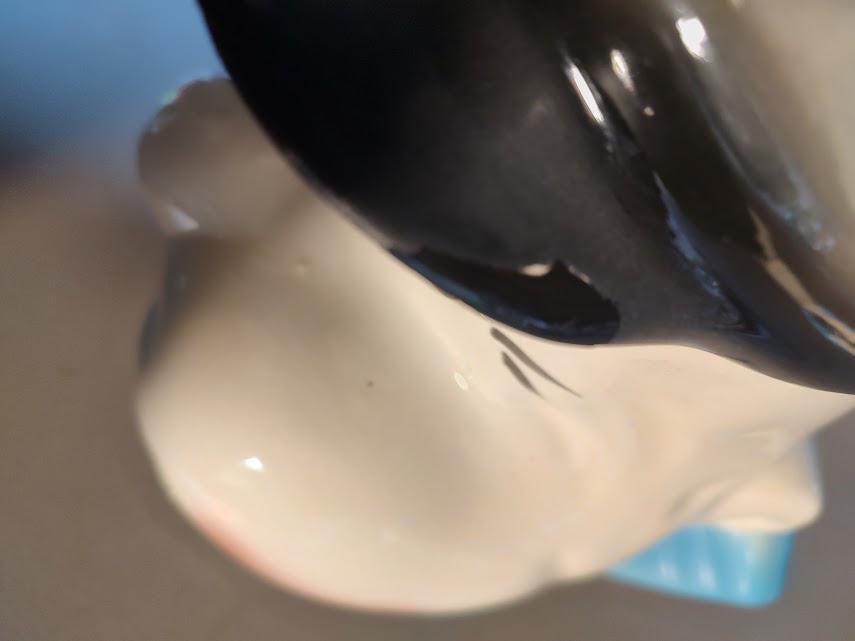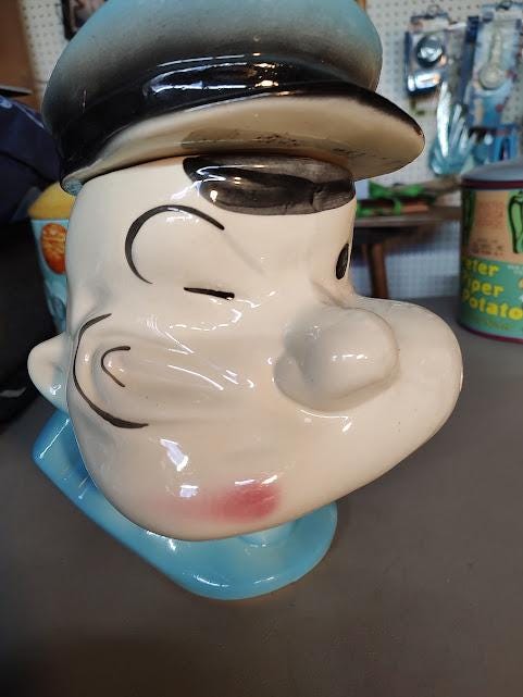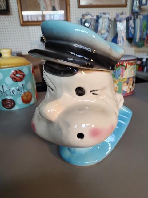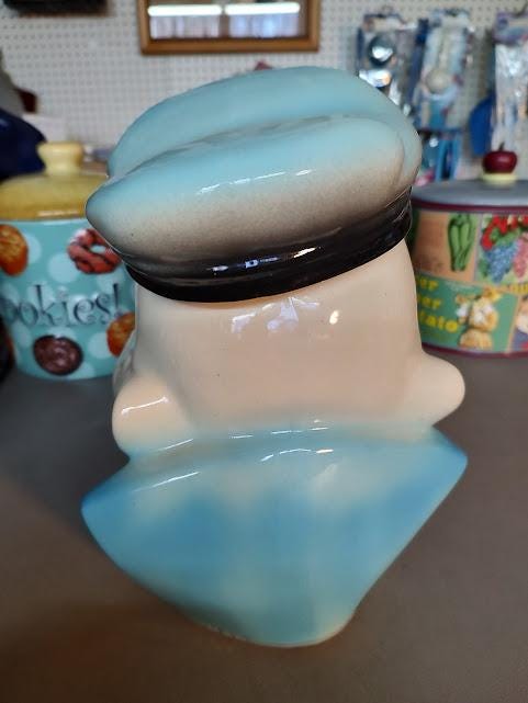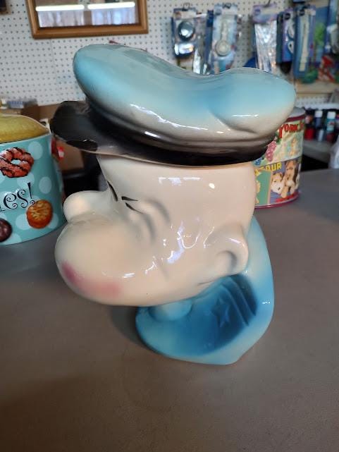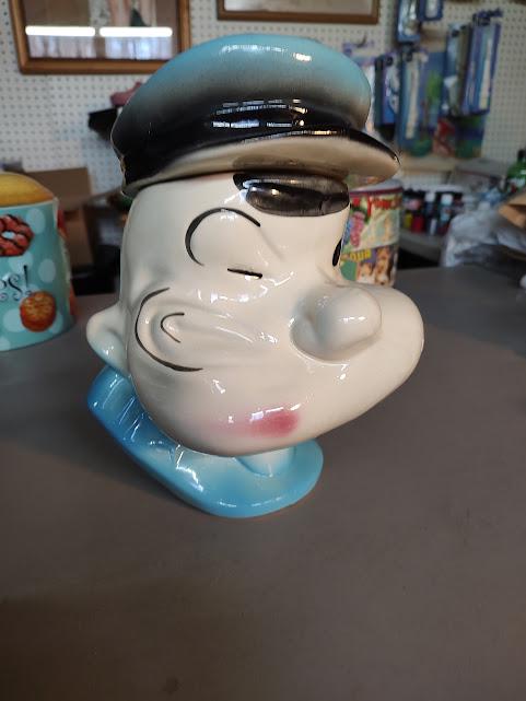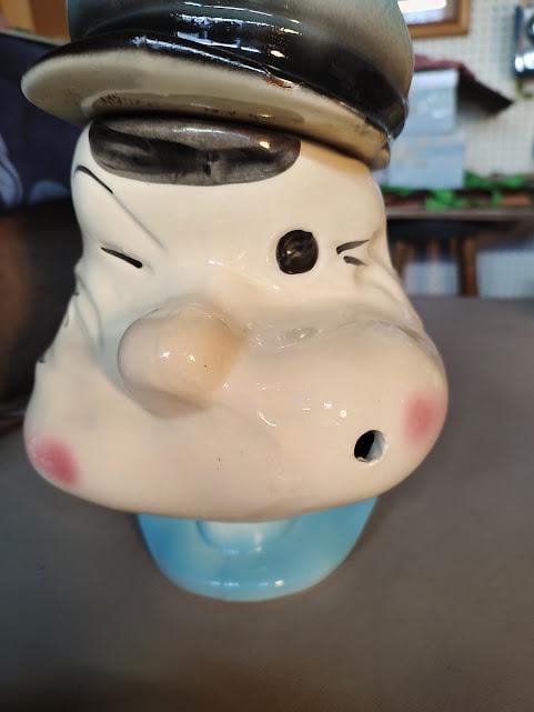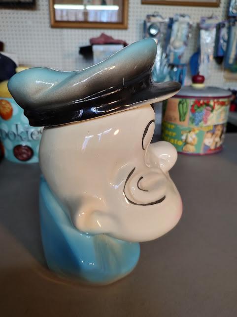 A vintage Popeye ceramic cookie jar from American Bisque. There has been a repair to his cap that looks like it was done long ago. Measures 10 1/2" x 7 3/4" x 7 3/4" and ships to you free. No pipe, so you'll need to find him one.