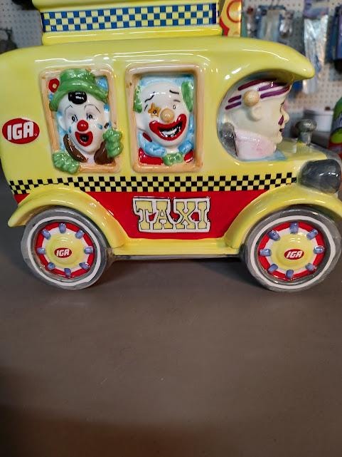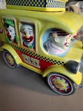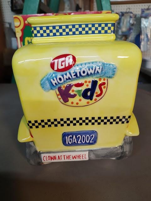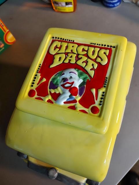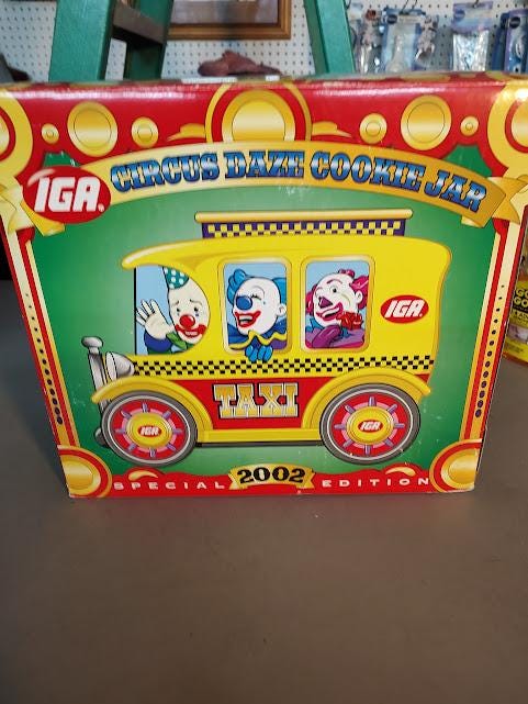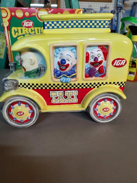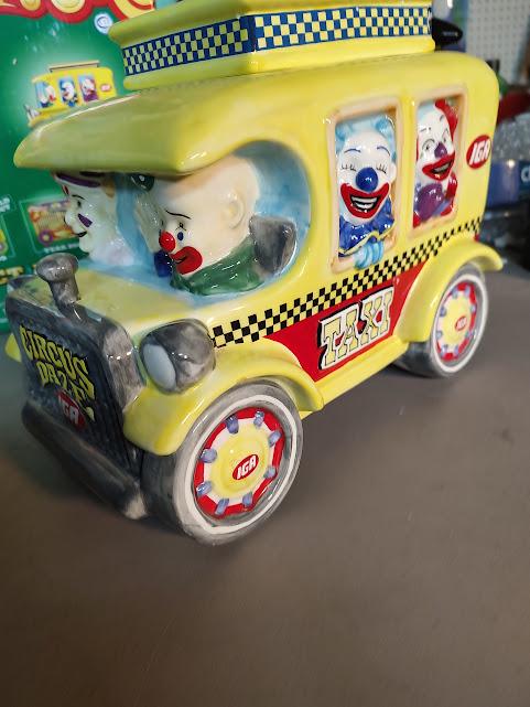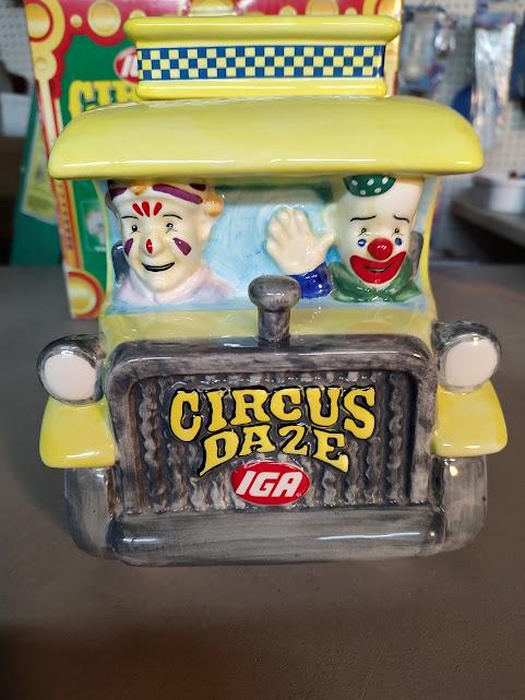 A still new in the box, Circus Daze ceramic cookie jar from IGA and made in 2002. Measures 9" tall, 11" long, and 7" deep and ships to you free.