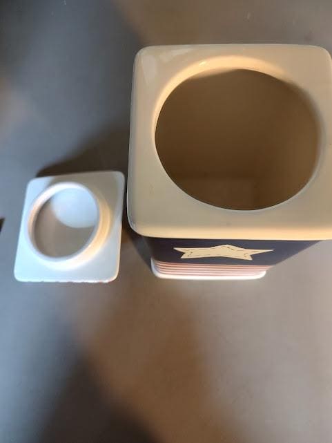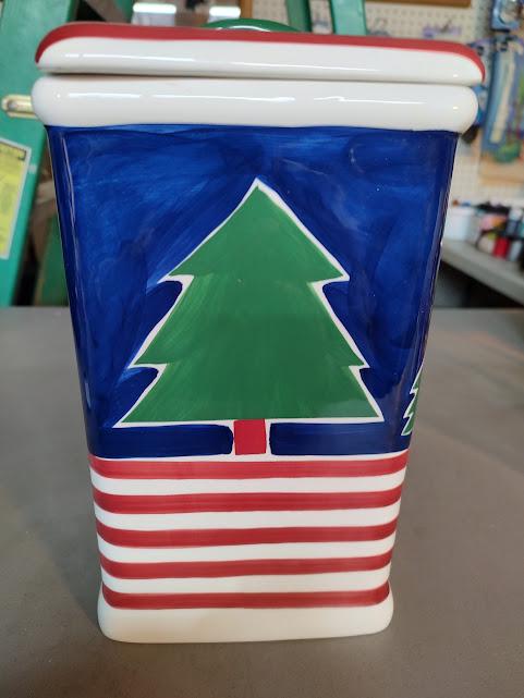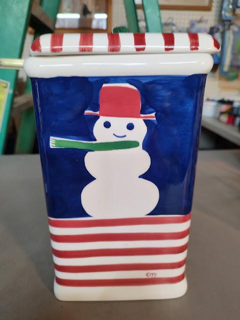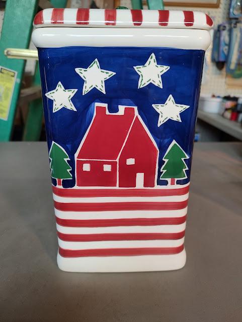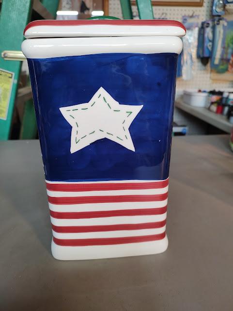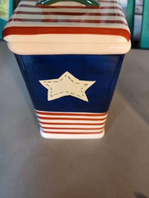 I've never seen this one before. It's an 11" tall, American country style ceramic cookie jar from at Home. Made in 1999, it in great condition and has the freshness seal. Ships free.