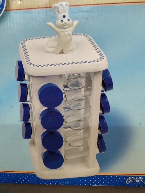 A still new in the box, Pillsbury Doughboy 14" tall spice rack from Lipper International. Made in 2004, this is new in the box and complete. Nice, and it ships free.