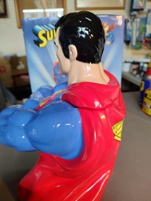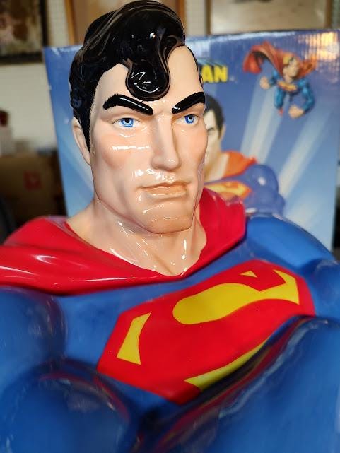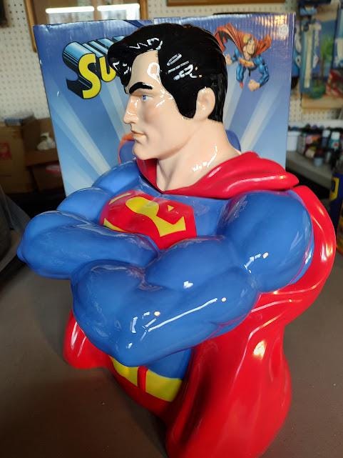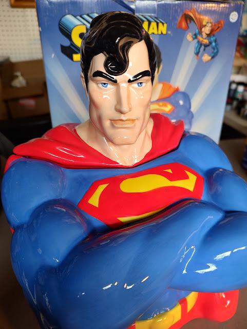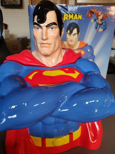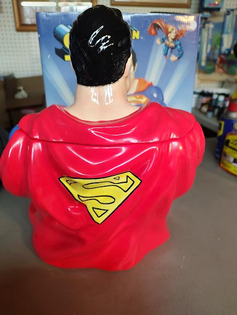 A still new in the box, limited edition, Superman ceramic cookie jar from Vandor and D C Comics. This large jar stands 13" tall and is still new from over 20 years ago. Makes a great gift and ships free.