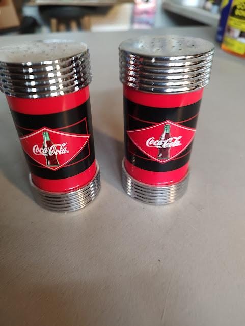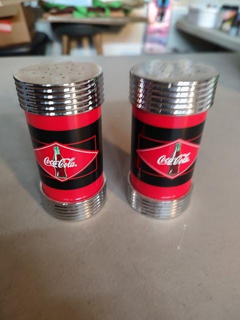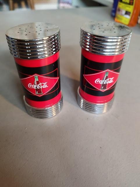 A nice pair of Coca Cola salt and peppers shakers. These are plastic with stainless steel caps, 4" tall. Never used and very nice with free shipping.