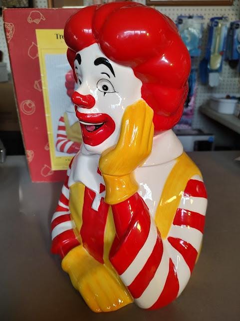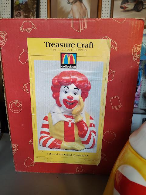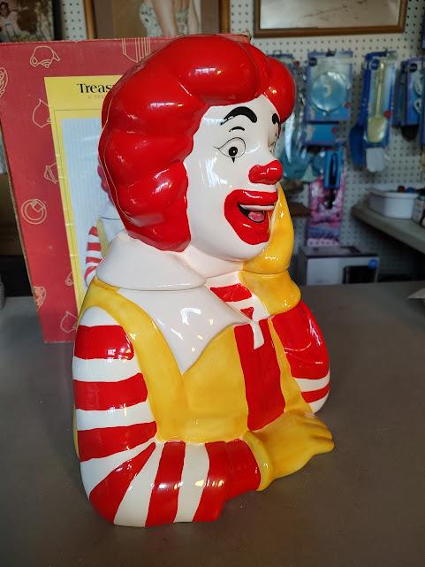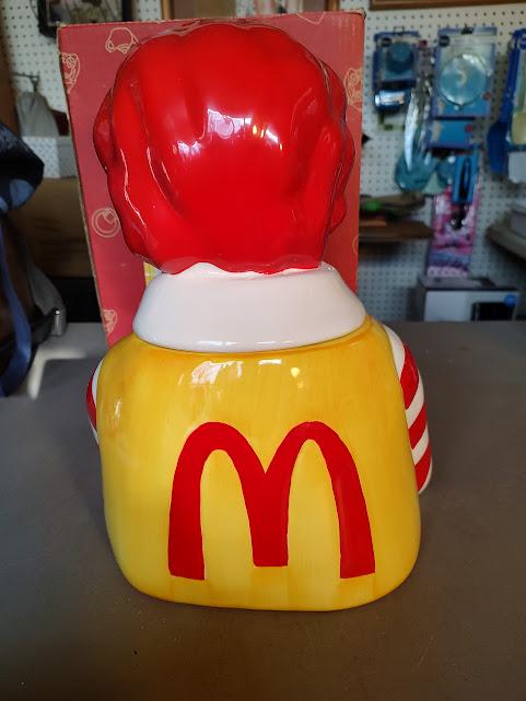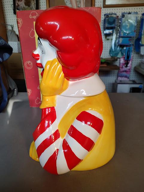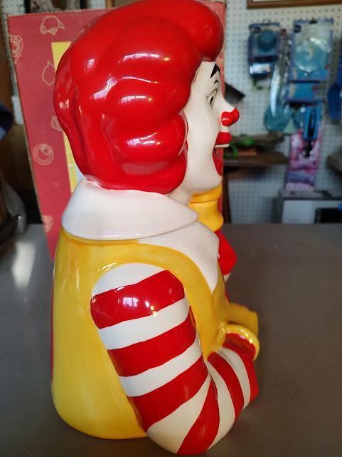 A still new in the box, Ronald McDonald ceramic cookie jar from Treasure Craft, made in 1997. He stands 13" tall and 9" wide and still has very bright color and he ships free. Makes a wonderful gift.
