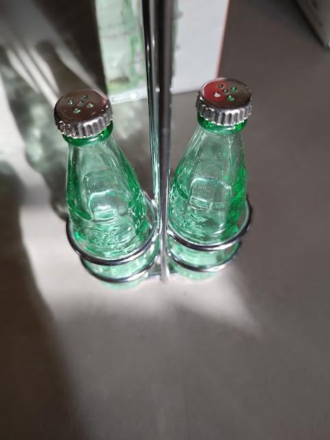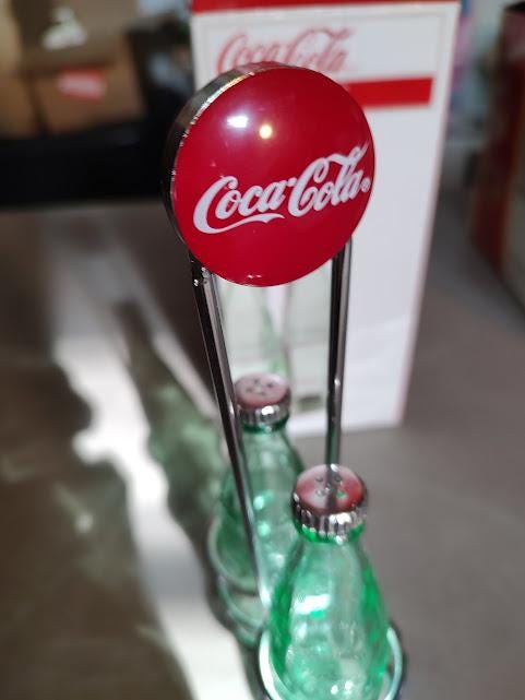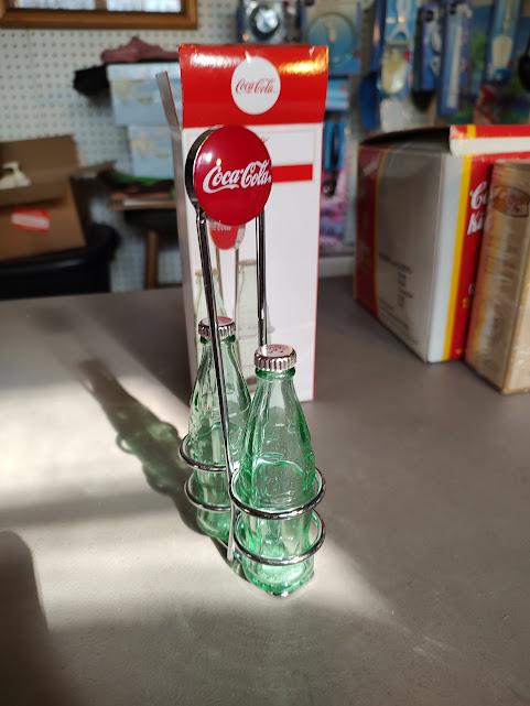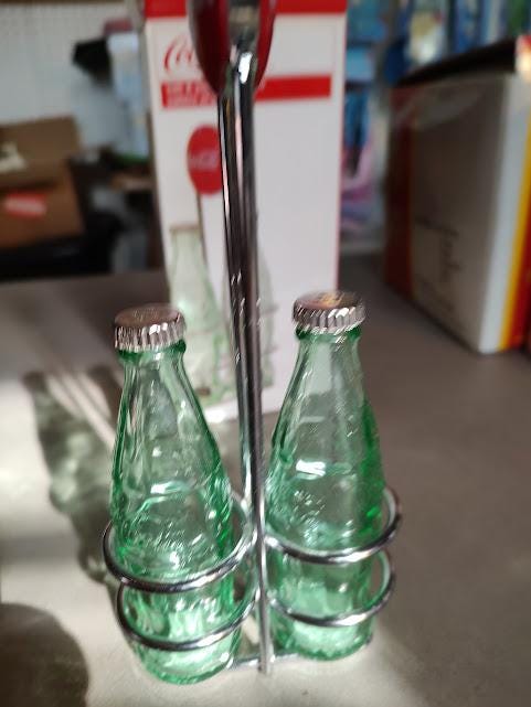 A still new in the box, glass Coca Cola bottle salt and pepper shakers in a metal stand. The bottles are 4 1/2" tall and the metal tops pop off for filling. Makes a great gift and ships free.