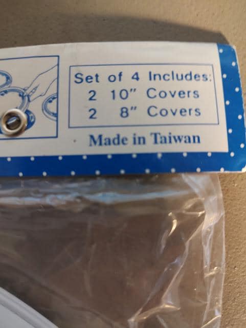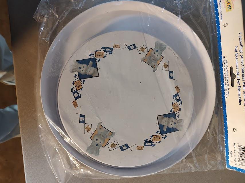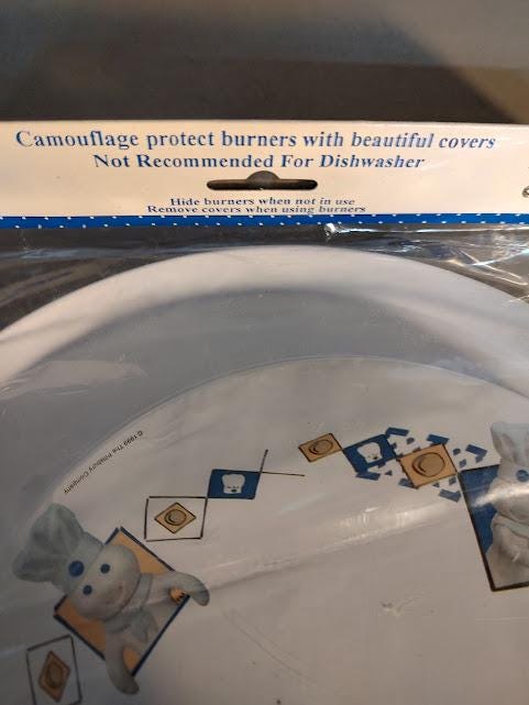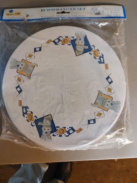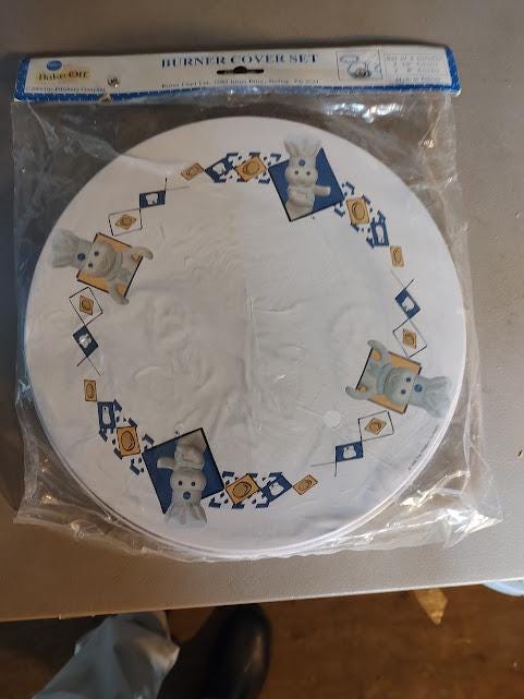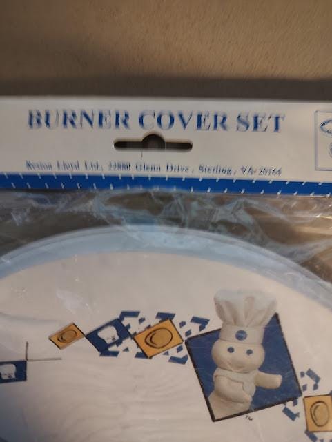 A still new in the package set of metal Pillsbury Doughboy burner covers from Restin Lloyd. Made in 2000, it includes 2 10" and 2 8" burner covers that ship free.
