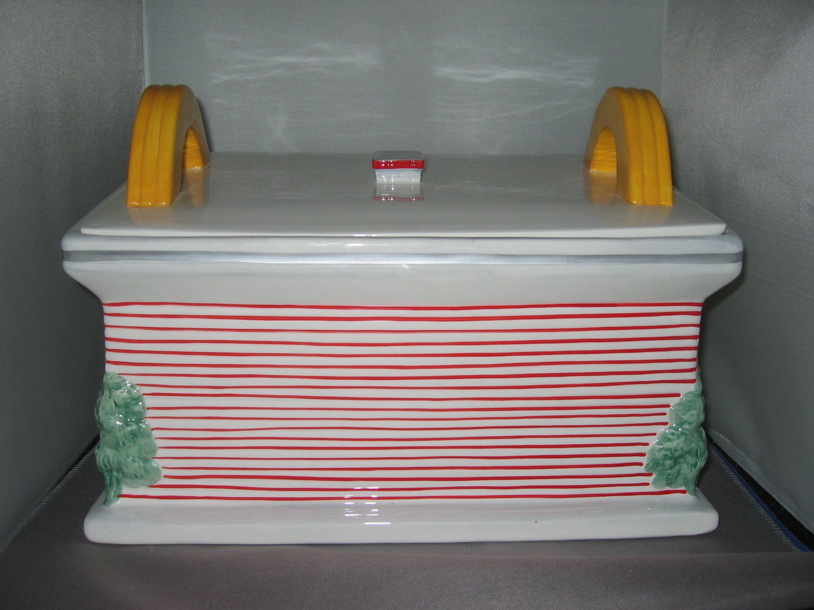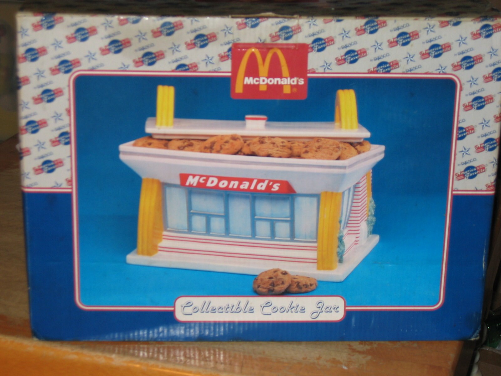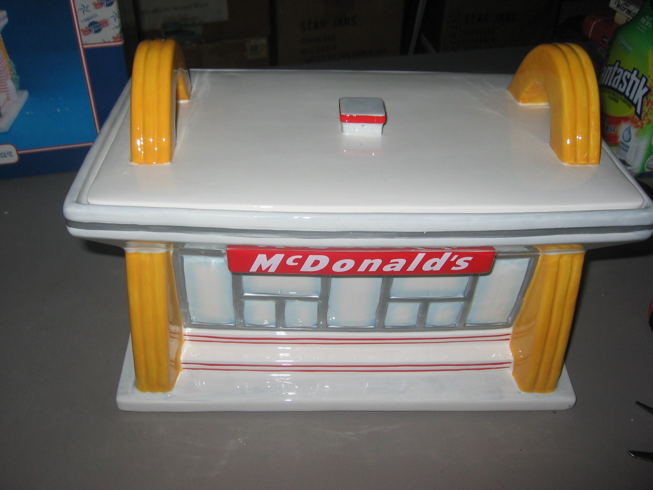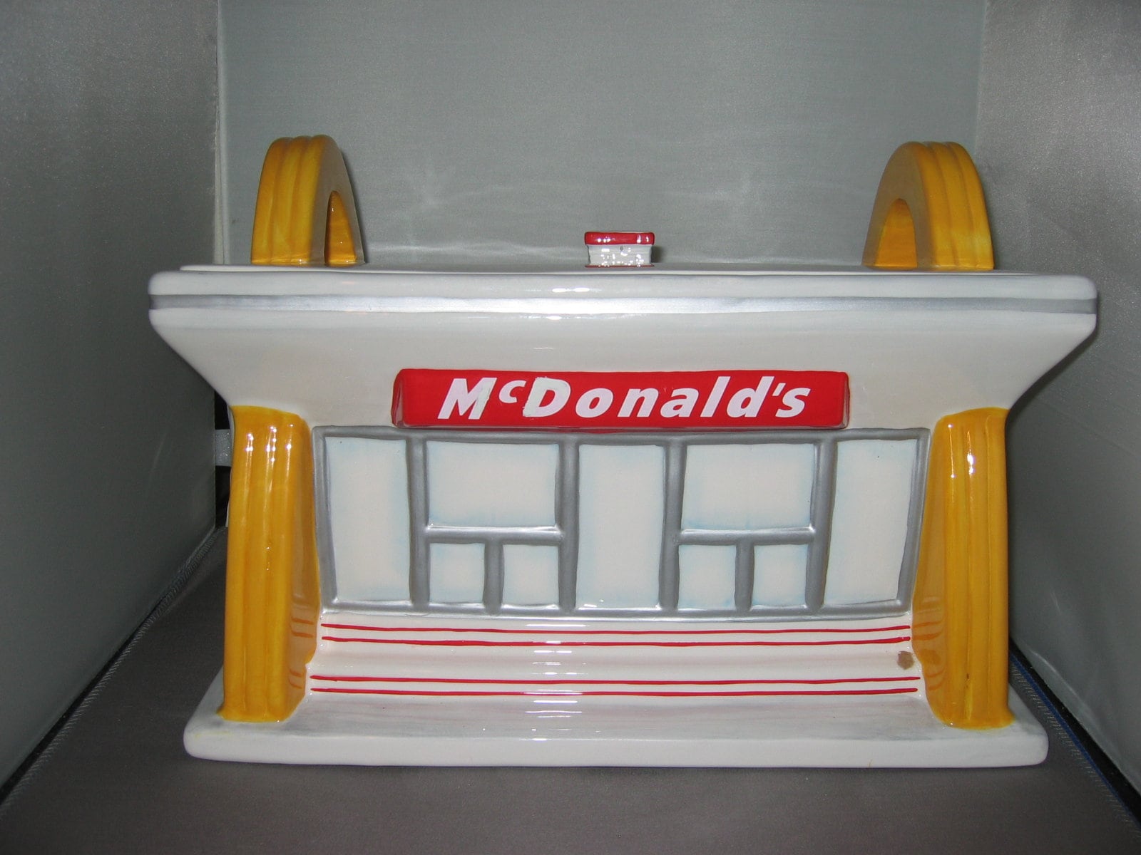 McDonald's building ceramic cookie jar from Enesco, mint in the box from 2000. This jar is 9" tall, 12" wide, and 8" deep and comes in the original box. This jar will be packaged carefully and shipped free. Makes a great gift.