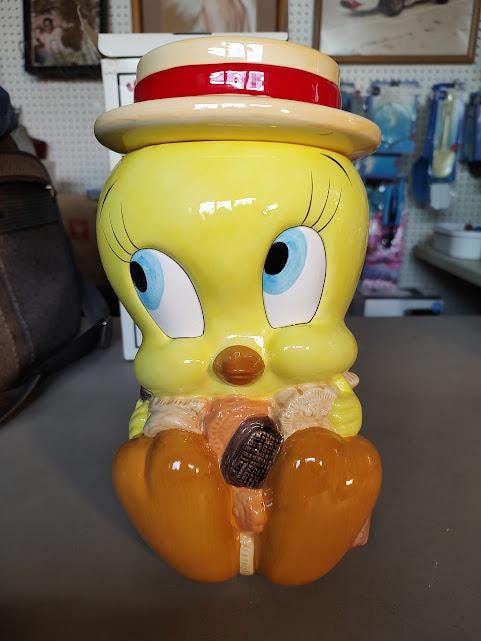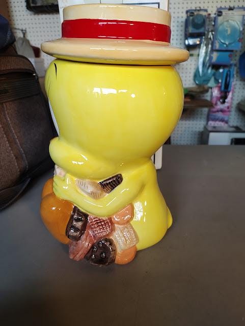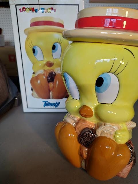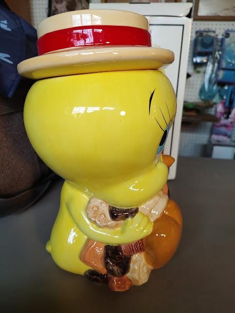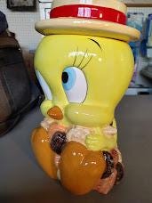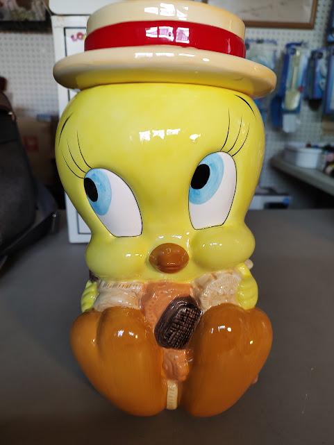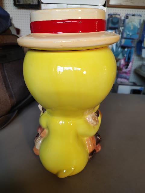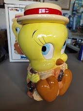 Tweety ceramic cookie jar from Looney Tunes. Made in 1993 for Warner Bros. and comes mint in the box. This jar will be packaged carefully. Makes a great gift.