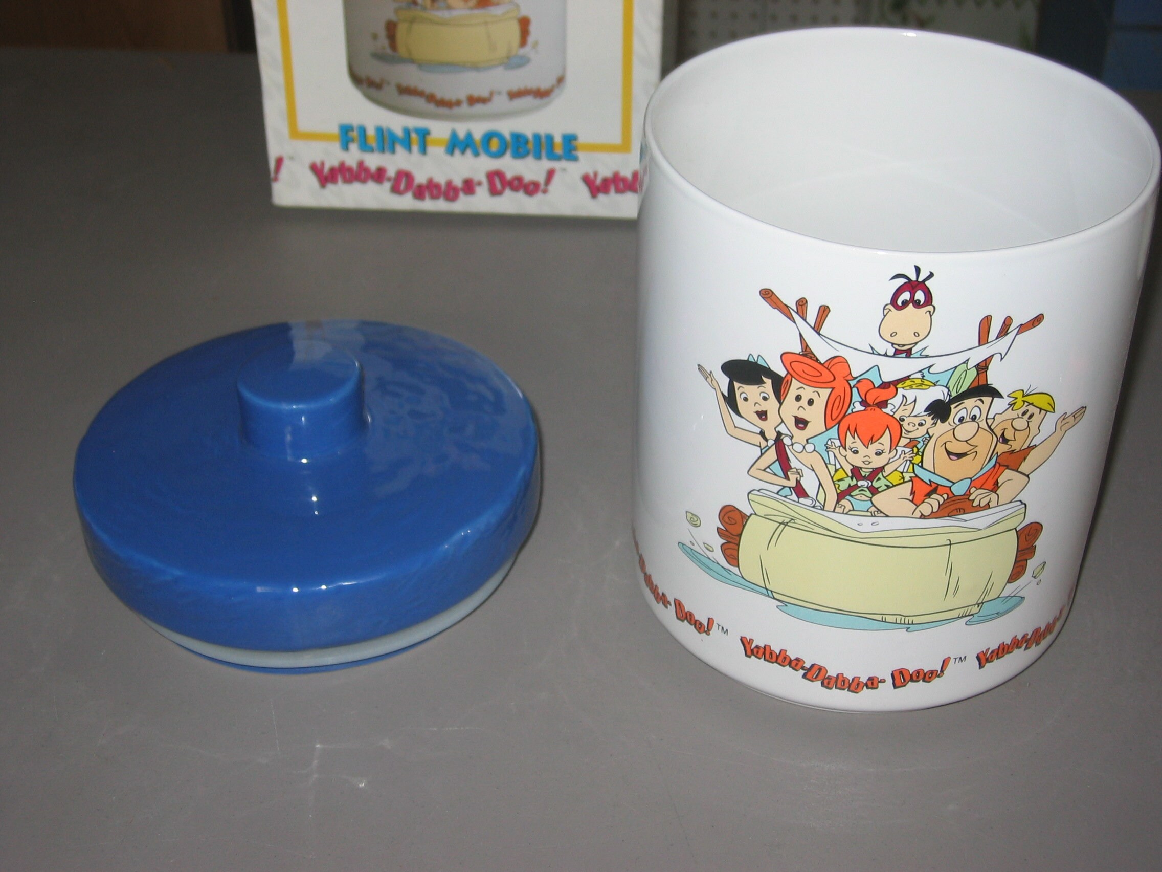 Get the whole Flintstones gang on this wonderful ceramic cookie jar from 1994. Measures 9 1/2" tall and 6 1/2" wide, this ceramic cookie jar is mint in the box. This jar will be packaged carefully.