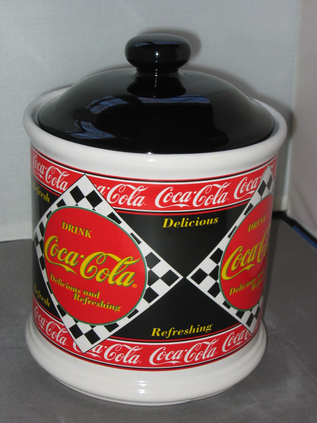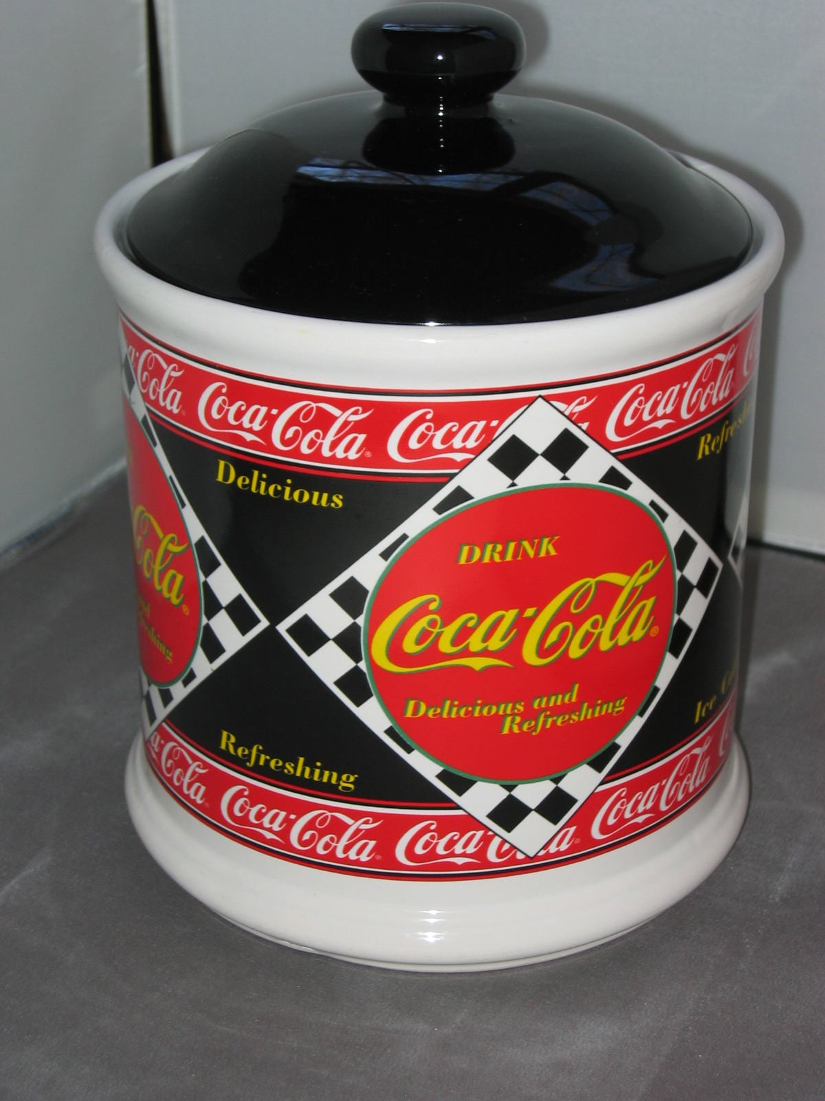 A very nice Coca Cola cookie jar from 1995. Awesome color on this jar, it measures 9" tall and 7" wide. Super jar for Coca Cola collectors. This jar will be packaged carefully and shipped free.