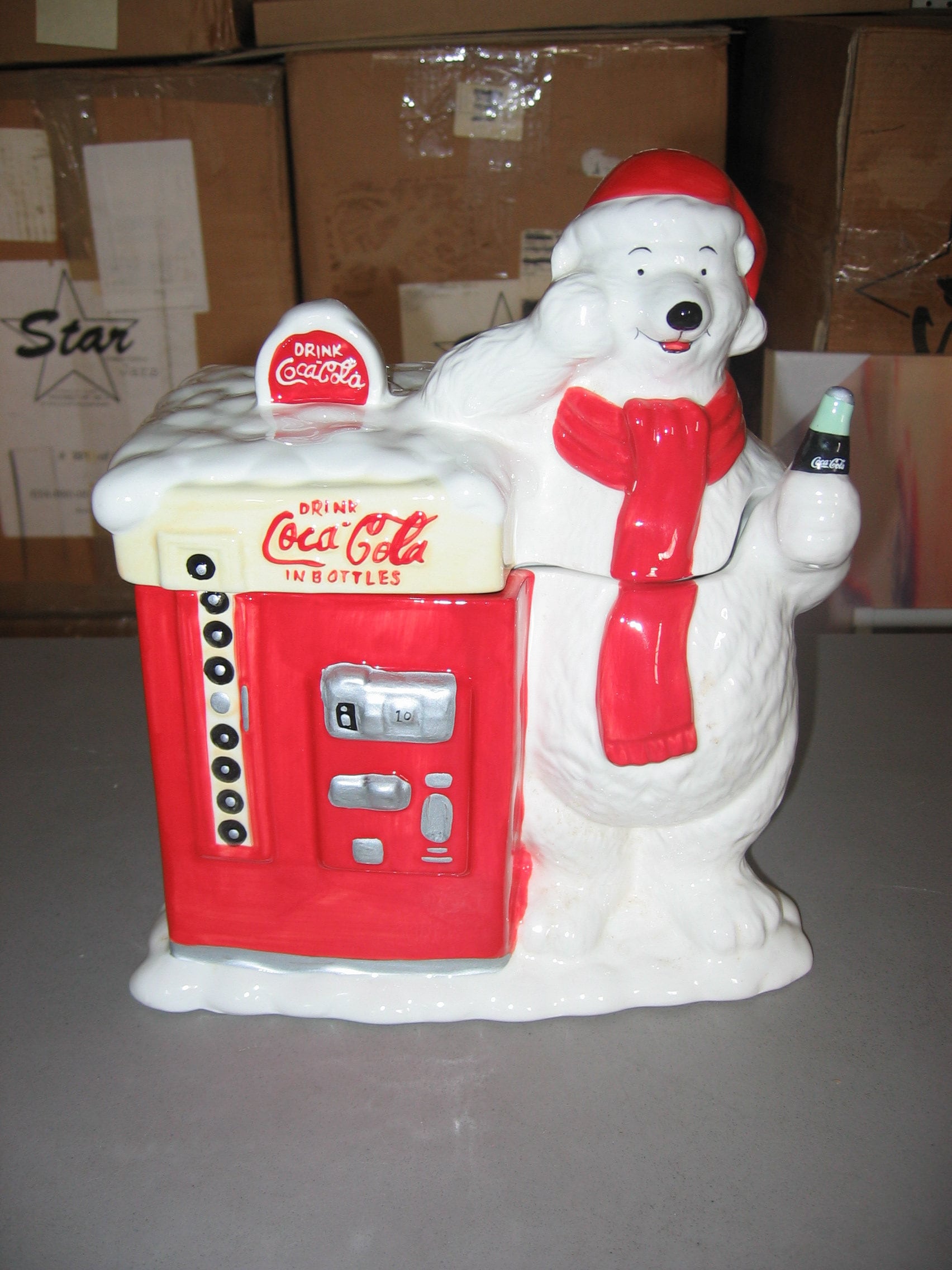 Coca Cola "Cool Break" ceramic cookie jar, slightly used and in good condition. Made in 1997, this jar is 10" tall, from the Coca Cola Company. Will be packaged carefully and shipped insured.