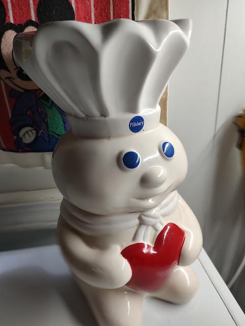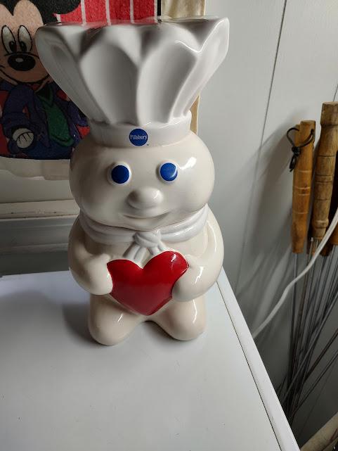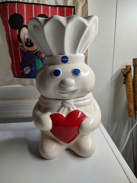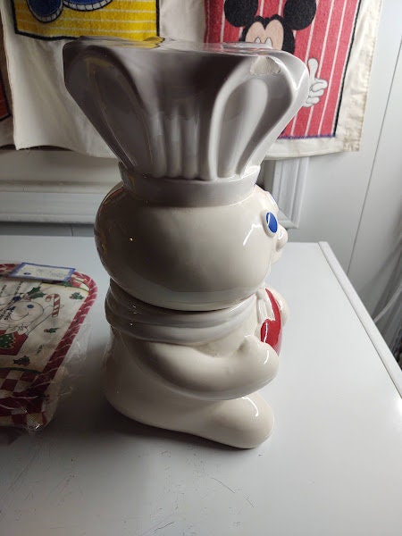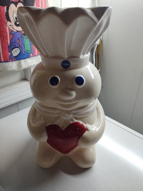 Slightly used, Pillsbury Doughboy "heart" style ceramic cookie jar. He stand 12" tall. No chips or cracks and it's a rare jar. No box but he ships free.