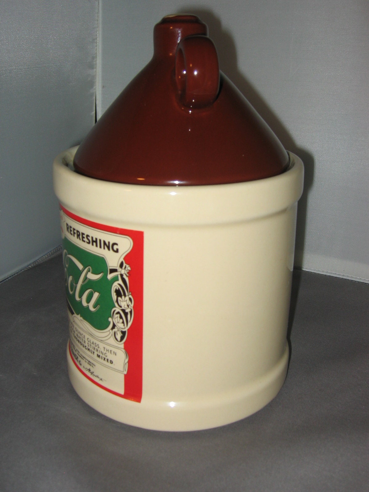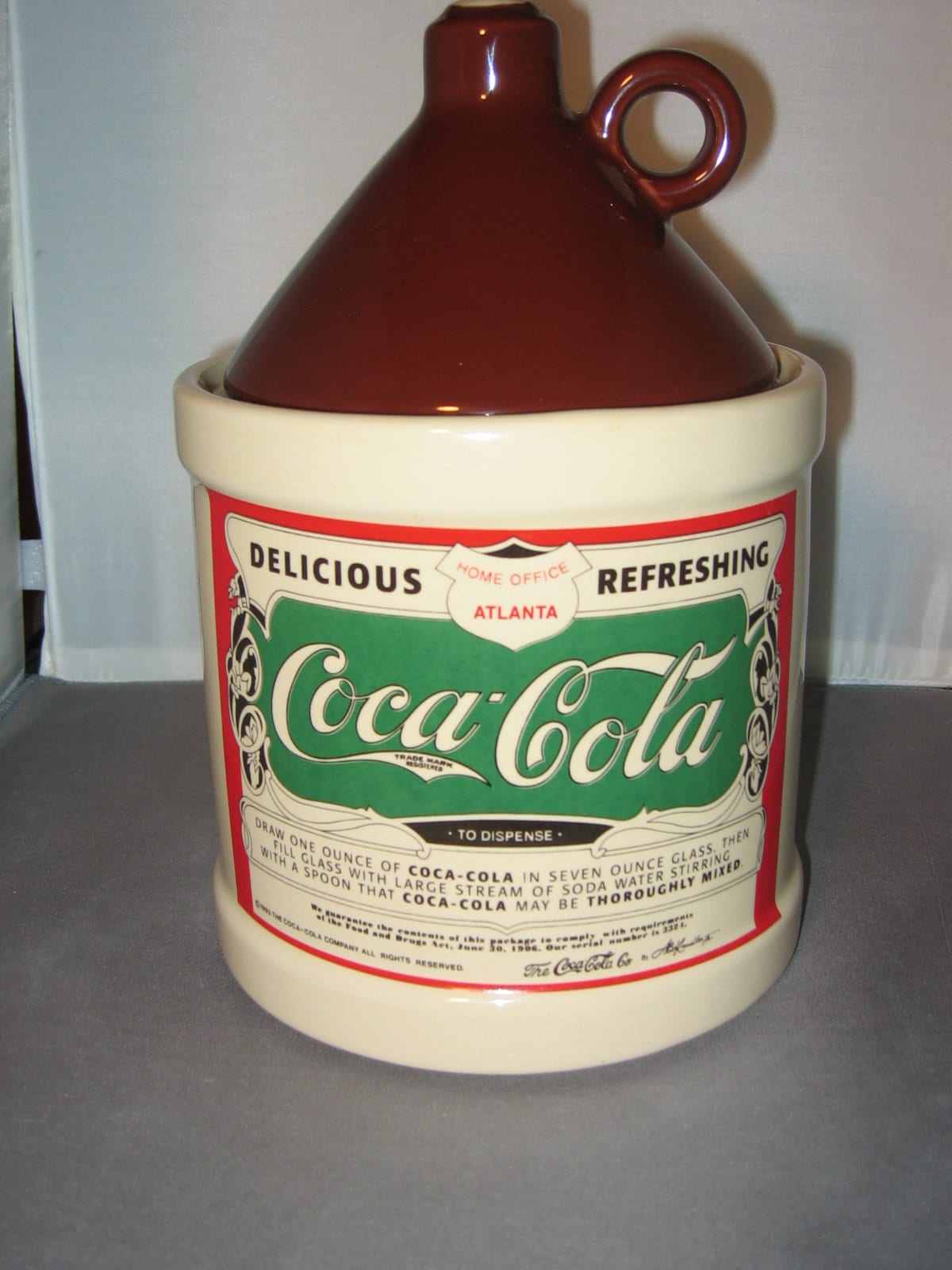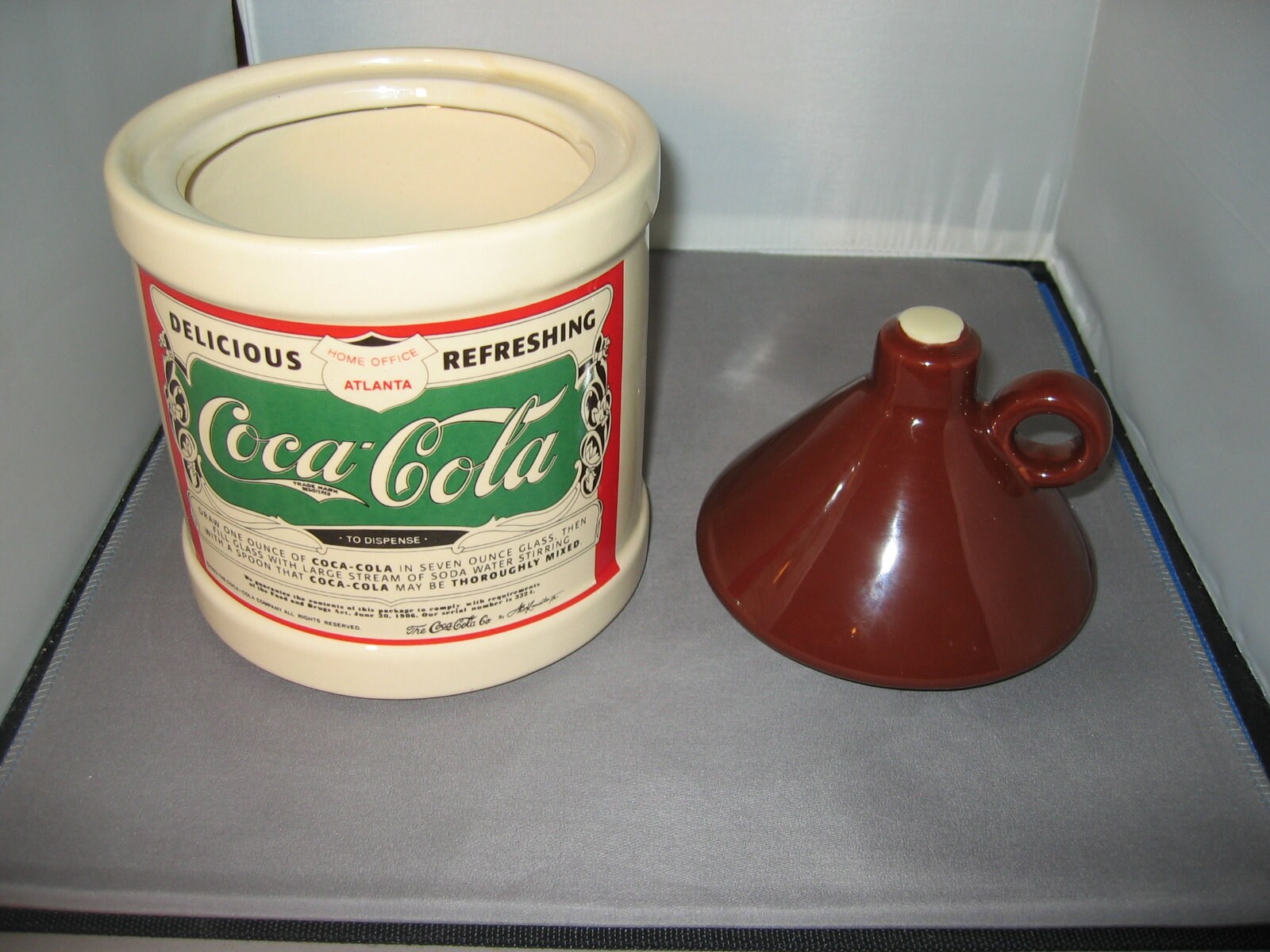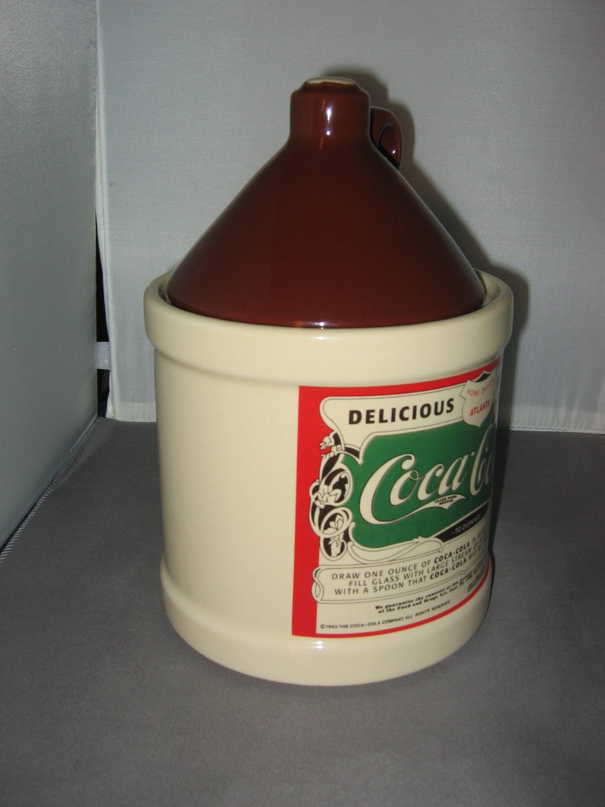 A very nice, mint condition, Coca Cola ceramic cookie jar from 1993. Not sure who made it for the Coca Cola company, but it's nice. A well made, heavy jar....... This jar will be packaged carefully and shipped insured.