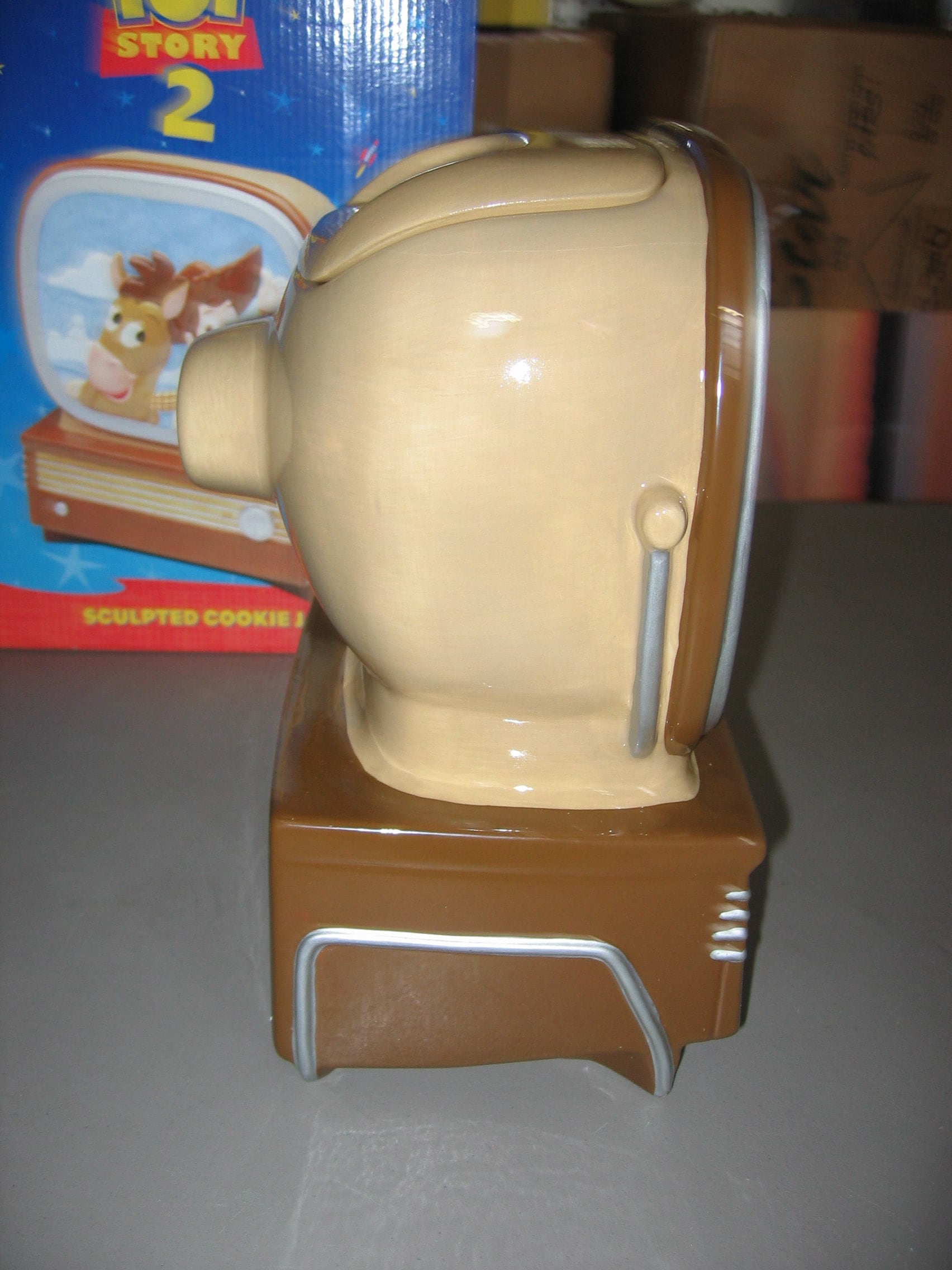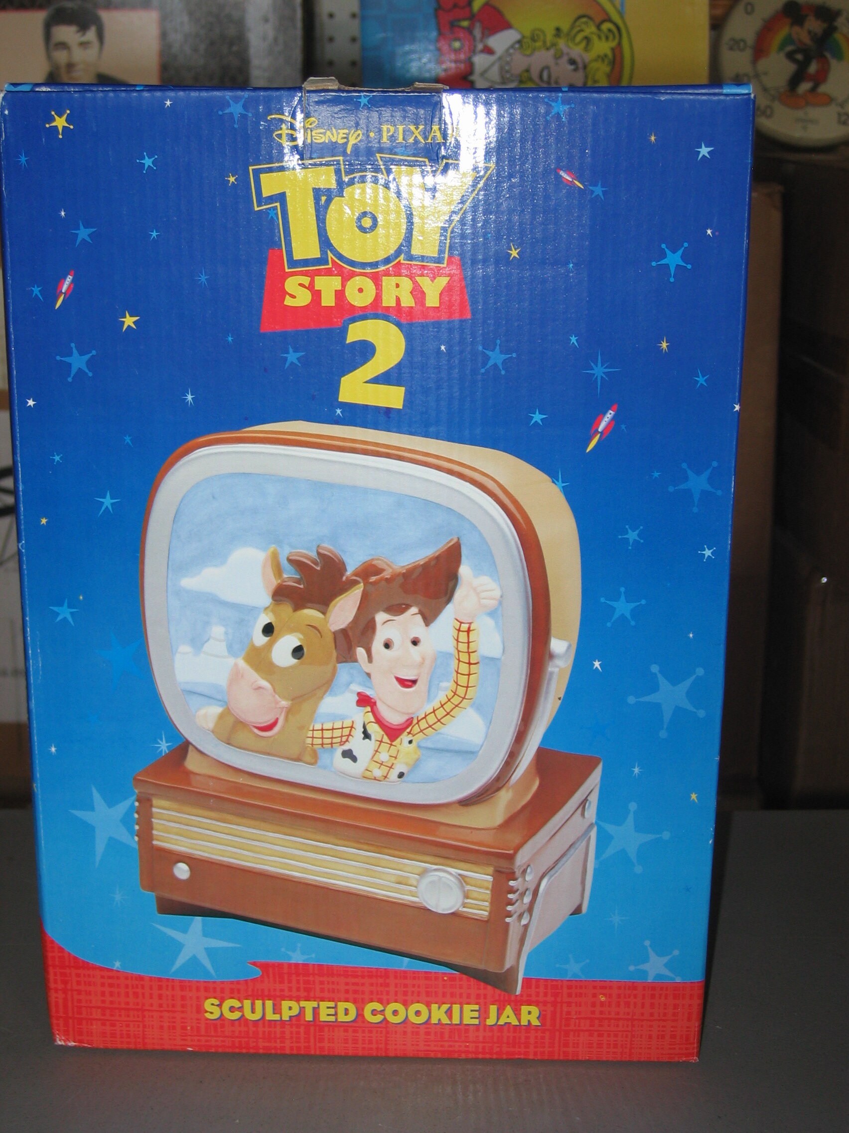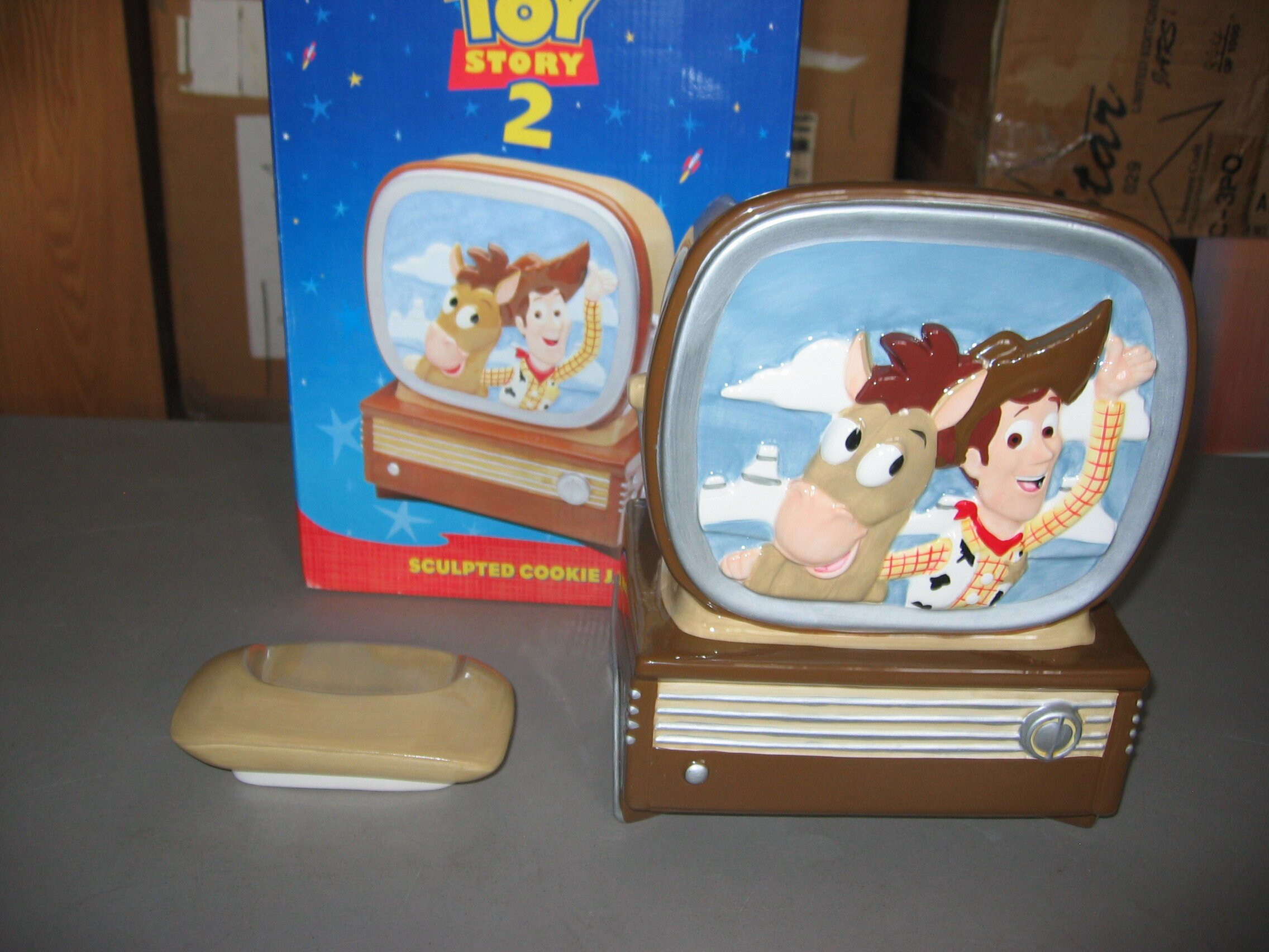 A mint in the box, Toy Story 2 ceramic cookie jar from Disney/Pixar. The box is not perfect and the jar was used for display, but it would make a wonderful gift. Shipped free and packaged carefully. The spots in the pictures are reflections.
