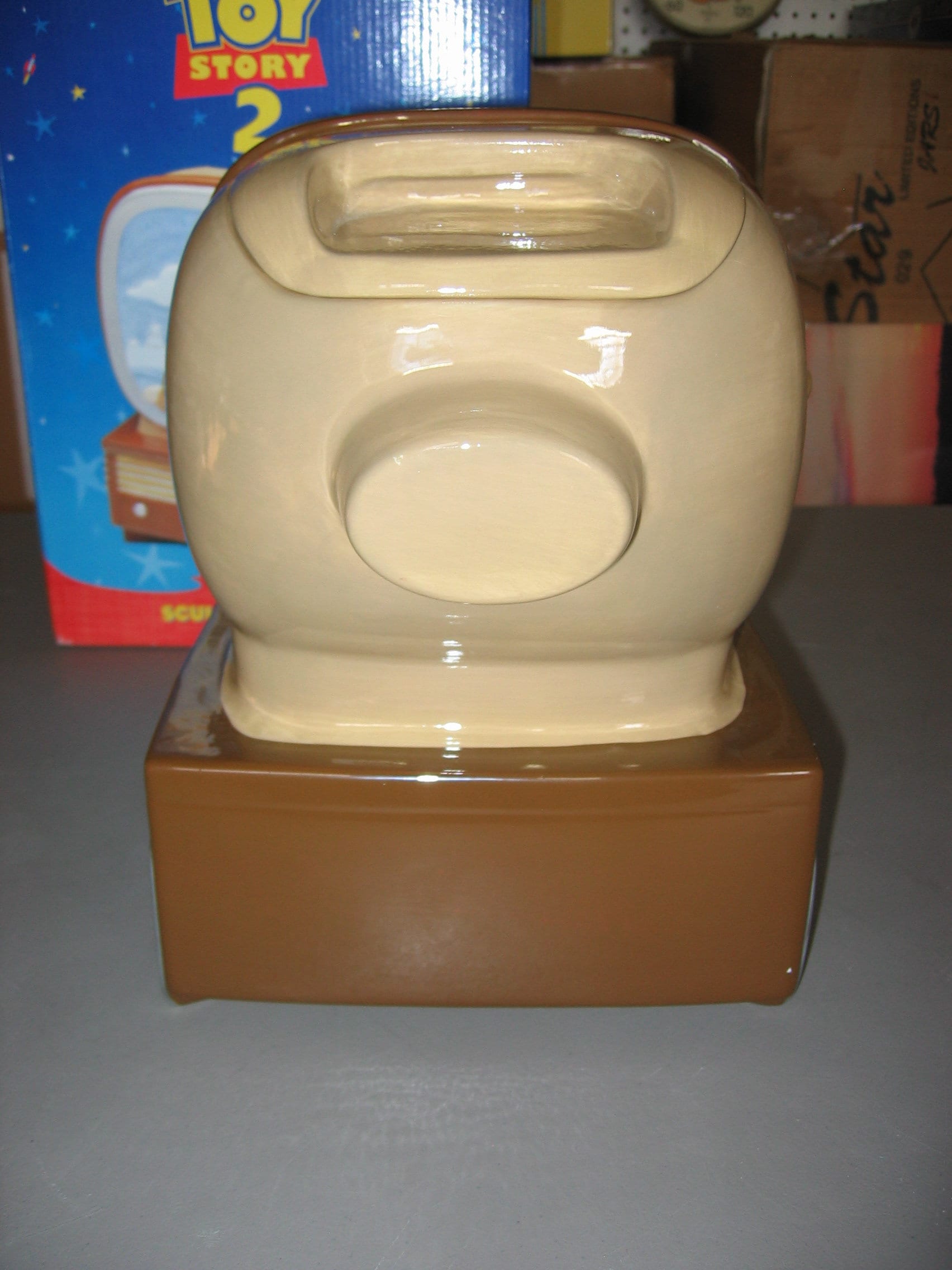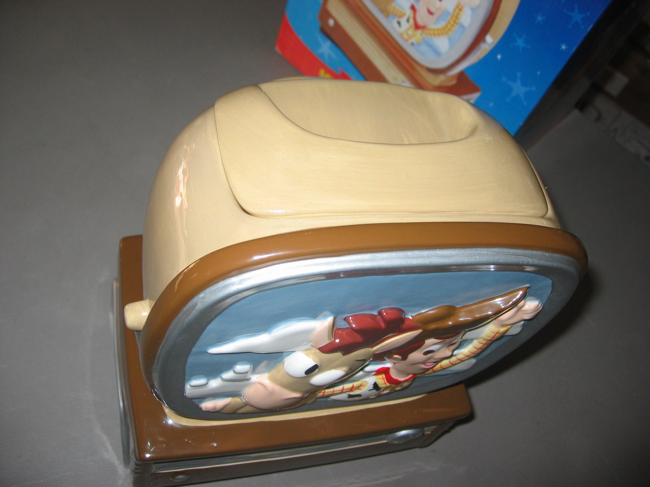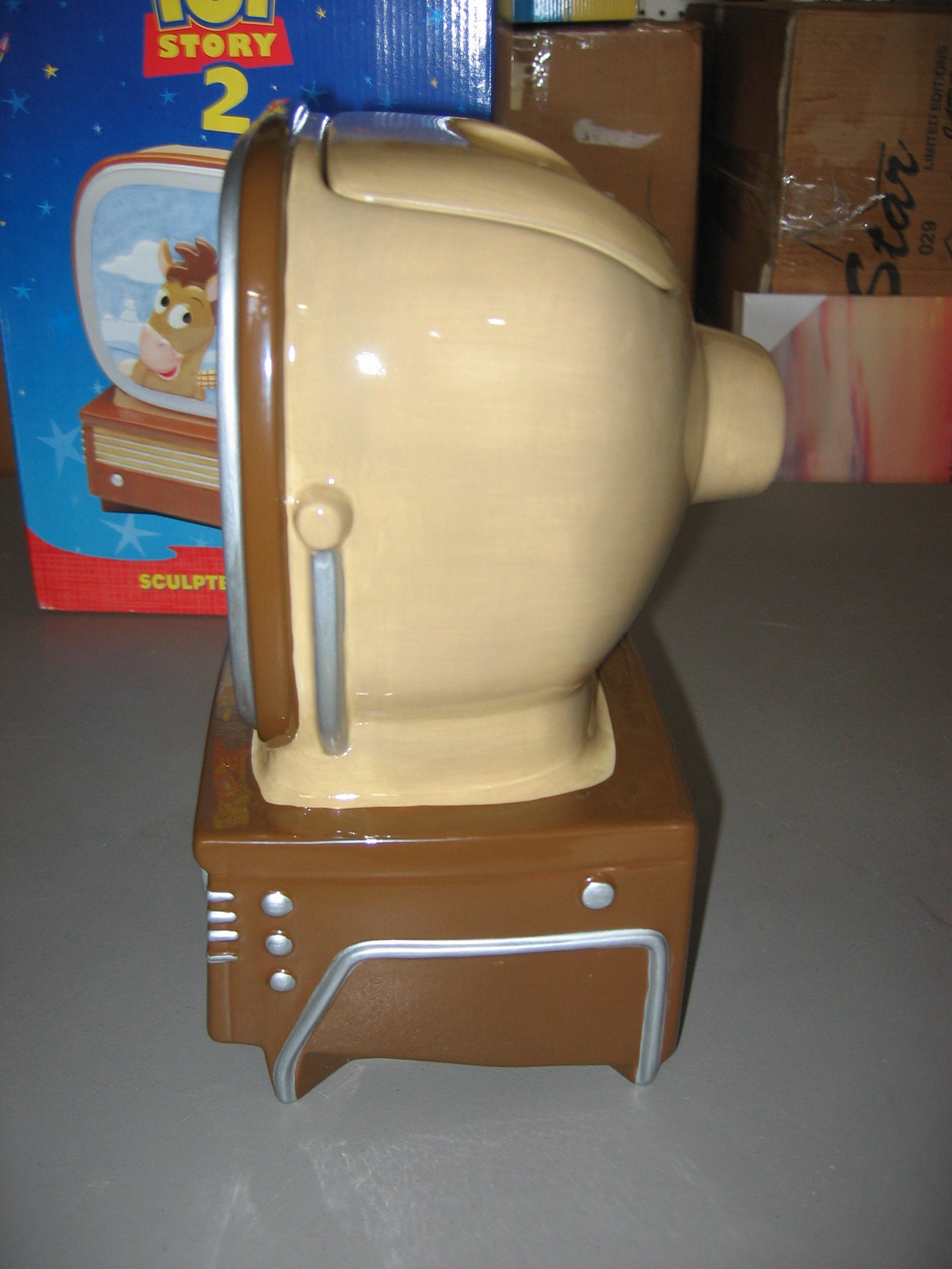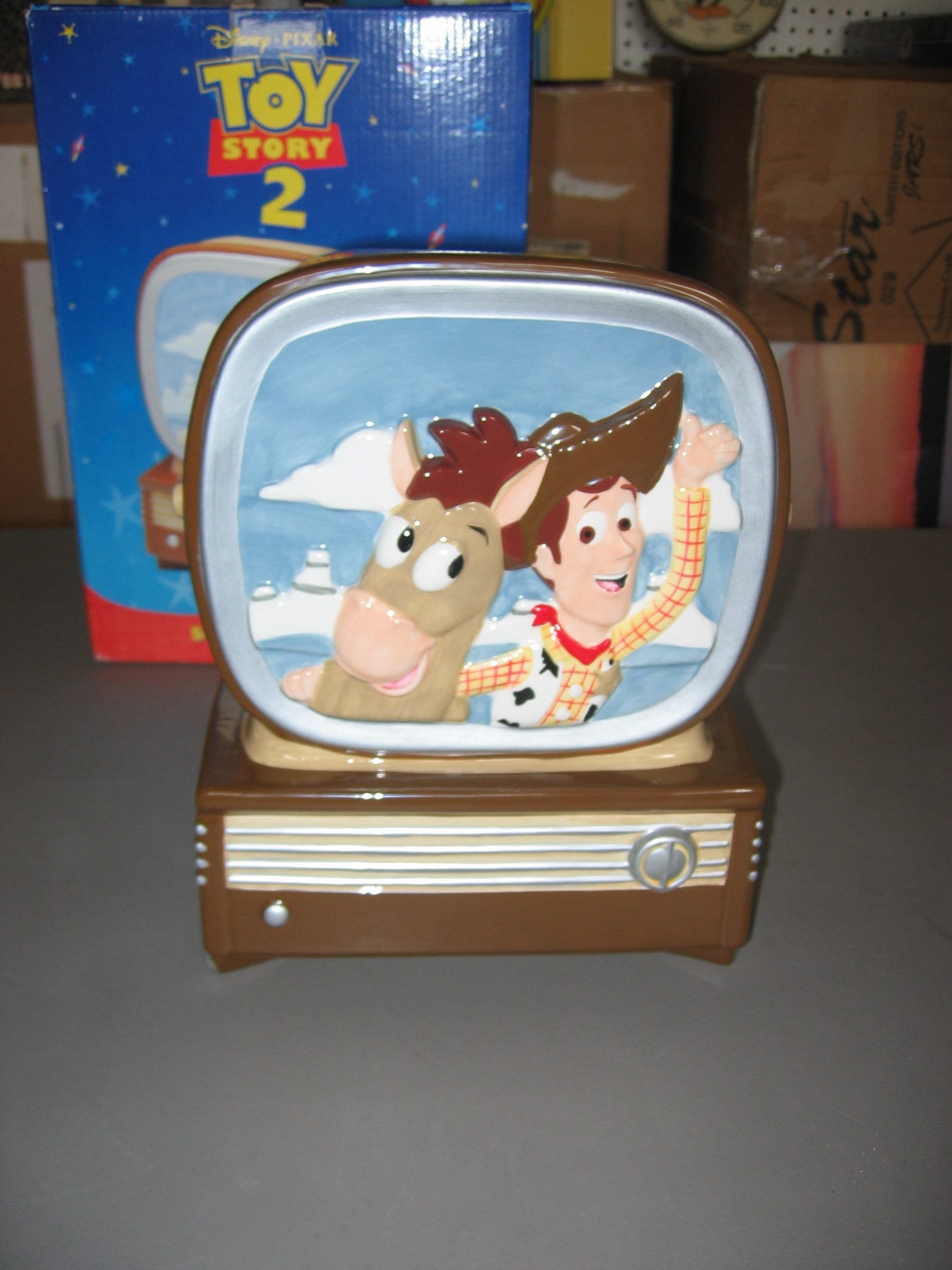 A mint in the box, Toy Story 2 ceramic cookie jar from Disney/Pixar. The box is not perfect and the jar was used for display, but it would make a wonderful gift. Shipped free and packaged carefully. The spots in the pictures are reflections.