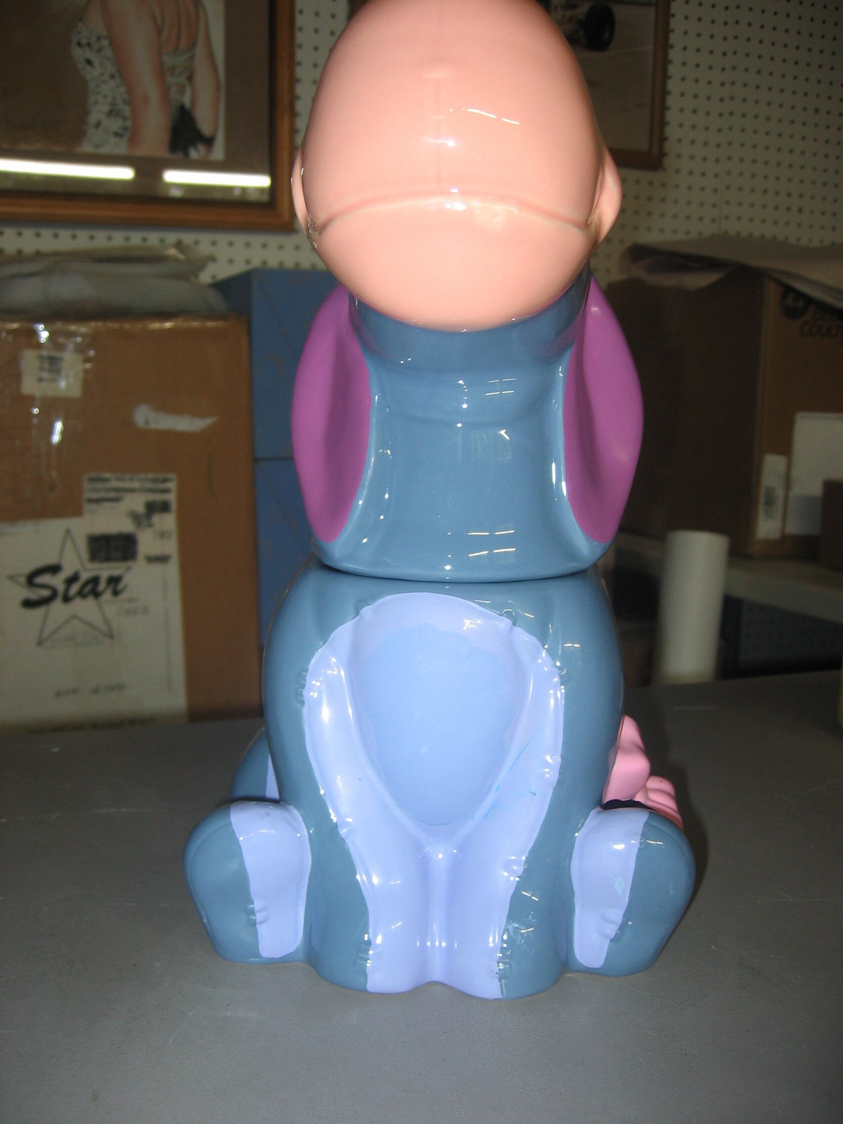 This Eeyore has had a few paint touch ups, but the jar is wonderful and it looks great. Made b.y Treasure Craft for Disney, this is a real favorite. In great condition and it ships to you free. No box for this one, but it's priced reasonable.